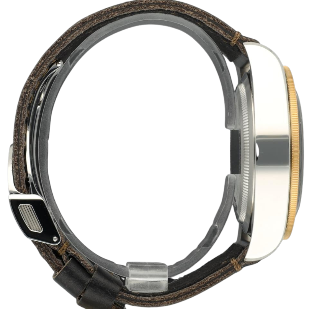 Powered by Tudor’s reliable automatic movement, this Black Bay offers impressive precision and durability, complemented by a water resistance of 200 metres. The combination of brushed steel and yellow gold creates a versatile balance between sport and luxury, while the black leather strap enhances its classic, understated appeal. This piece transitions effortlessly from daily wear to more formal settings, maintaining a strong wrist presence throughout.