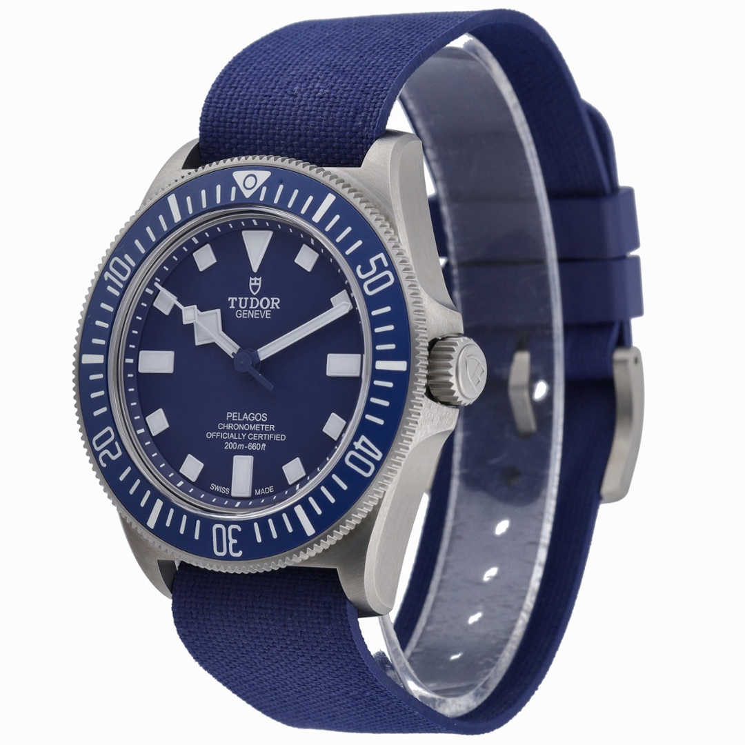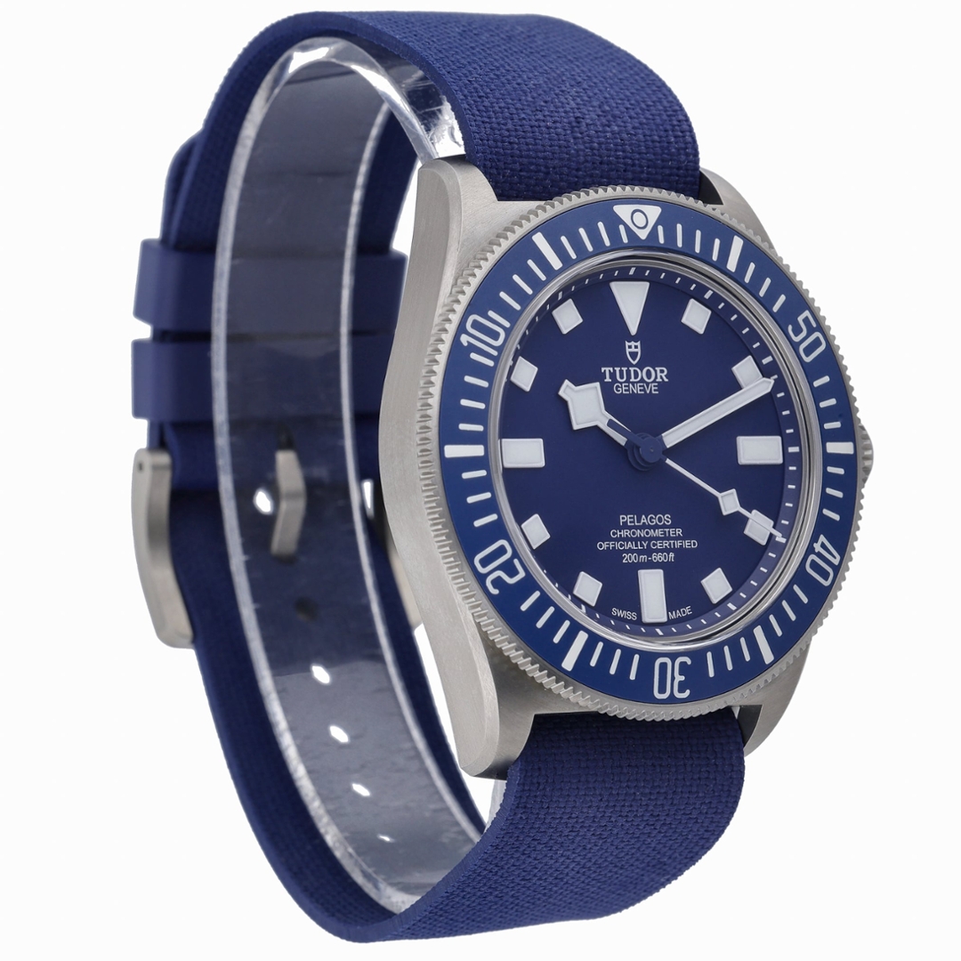 A Tudor Pelagos FXD reference 25707B/22 presented in a lightweight titanium case with a striking blue dial and matching blue ceramic bezel. Designed with purpose and precision, the 42mm case features fixed strap bars that set the FXD line apart and is paired with a durable blue fabric strap for a secure and comfortable fit. The bold, luminous hour markers and signature snowflake hands ensure exceptional legibility, which is reinforced by the clean, functional dial layout.