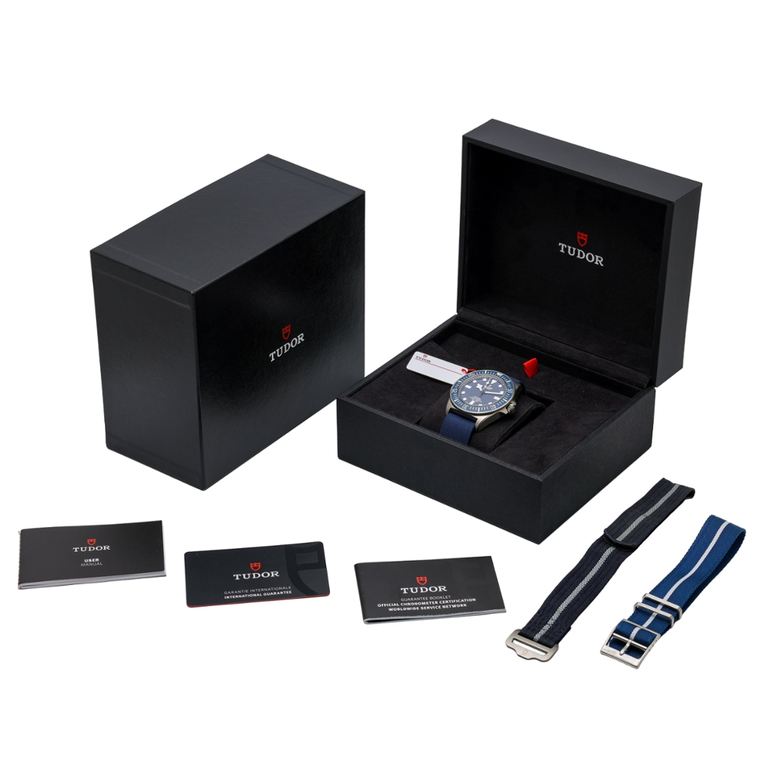 A Tudor Pelagos FXD Watch, Blue Fabric Strap with a Titanium Case & Clasp on a Blue Bezel & Dial.