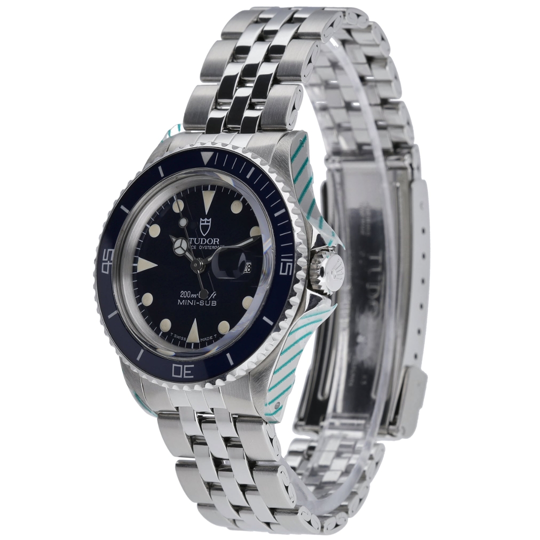 A Tudor Prince Date Submariner, model 73090, presented in stainless steel with a blue bezel and matching dial, offering a classic, highly collectable vintage dive-watch aesthetic. The 33mm case delivers a more compact and refined wrist presence, while retaining the robust design language associated with Tudor’s Submariner line. The dial features luminous hour markers and signature Mercedes-style hands for excellent legibility, alongside a date display at 3 o’clock with Cyclops magnification.