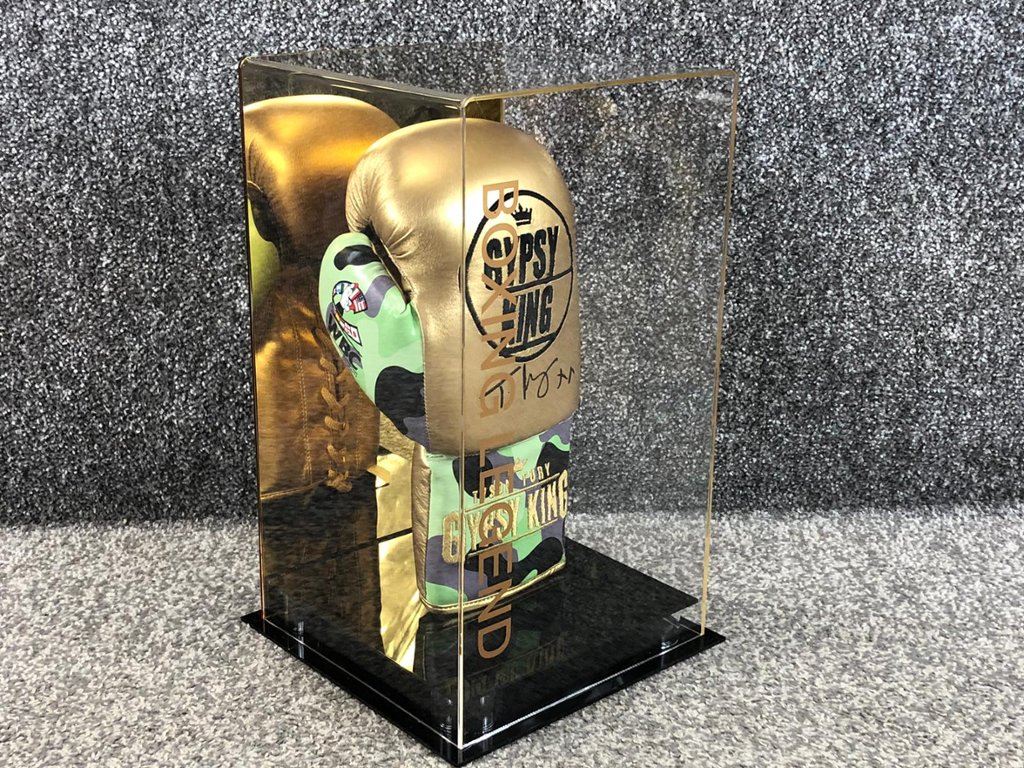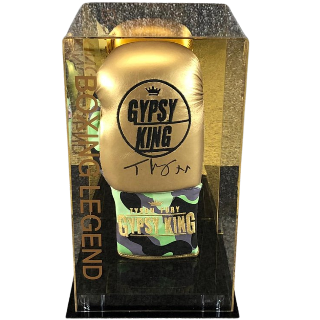 A signed and authenticated Tyson Fury Gold & Camo Boxing Glove in a presentation case. Approx 15" height, 9" width.