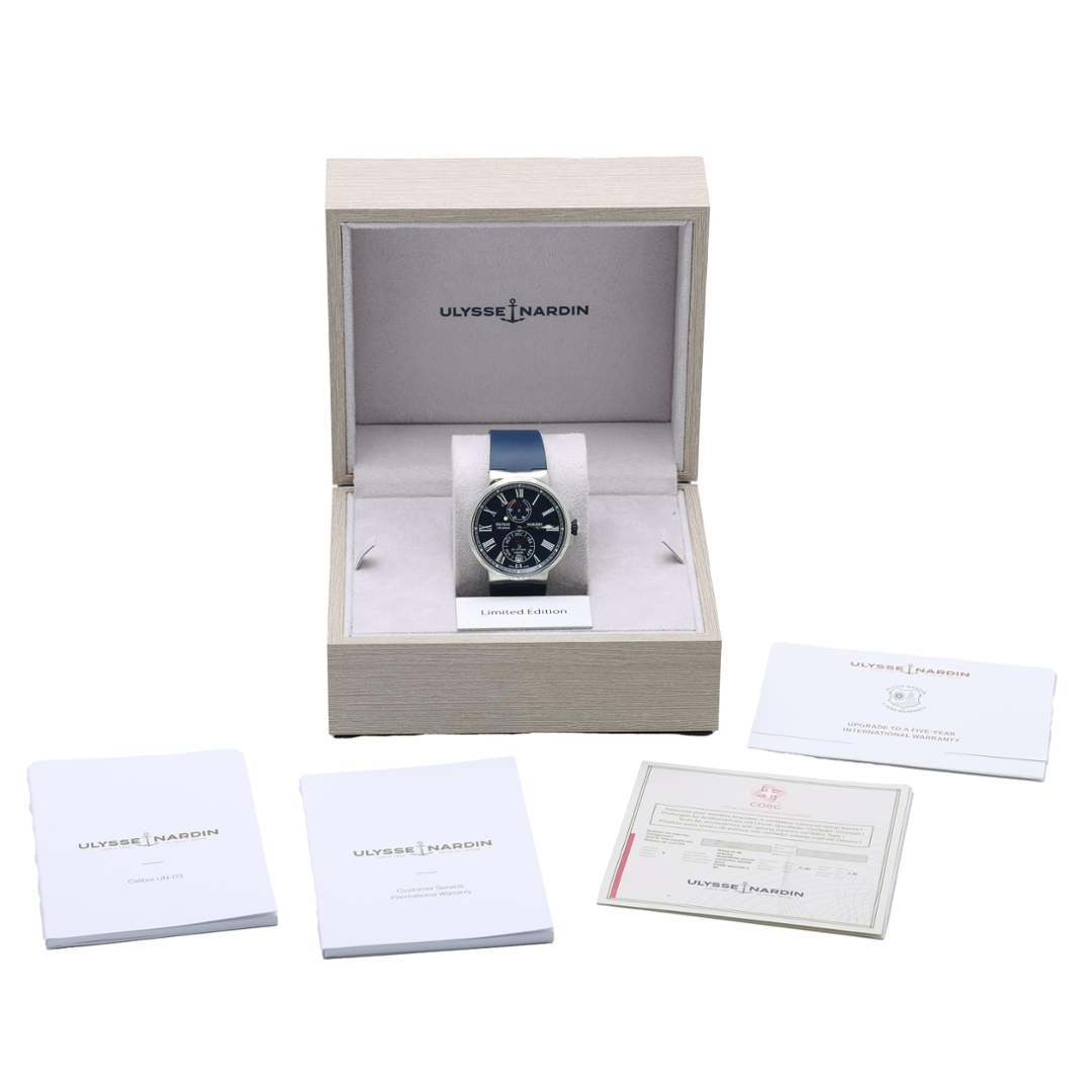 A Ulysse Nardin Marine Chronometer combines modern sport styling with the brand’s long-standing maritime heritage. The 43mm stainless steel case is paired with a blue rubber strap and matching clasp, framing a richly detailed blue dial with Roman numerals and a world-map motif.