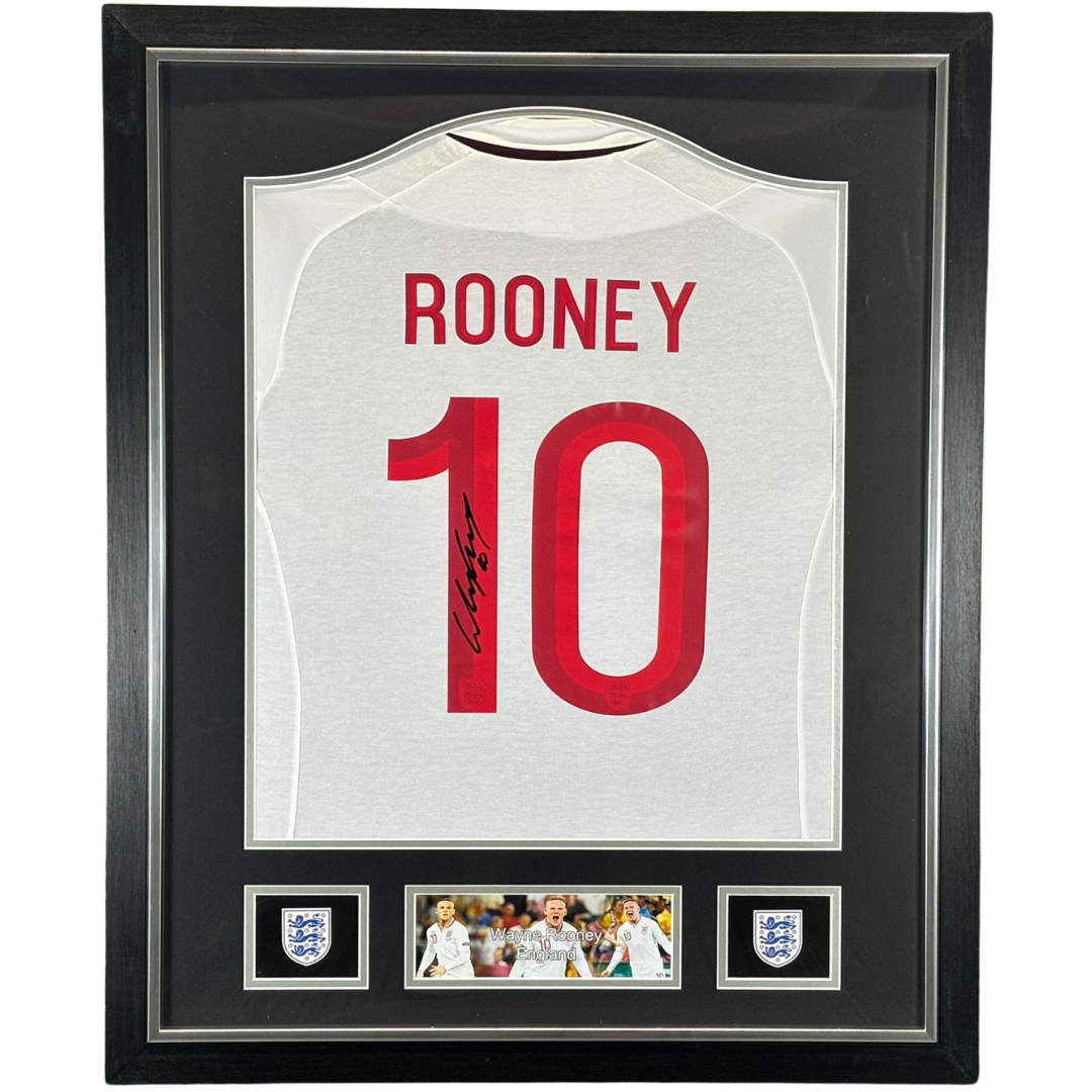 The elegant layout includes two official England crests and an image montage capturing Rooney in action for his country, celebrating the passion, determination, and talent that made him England’s all-time leading goalscorer. The crisp white shirt, bold red numbering, and premium double mount give the display a clean, sophisticated finish.