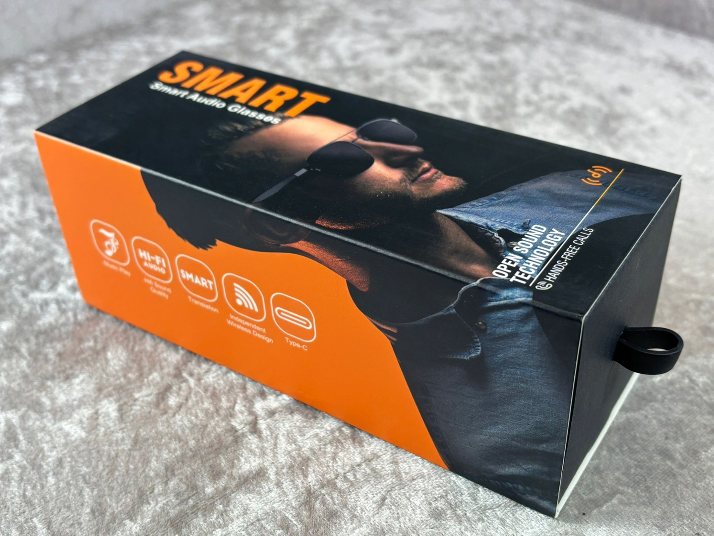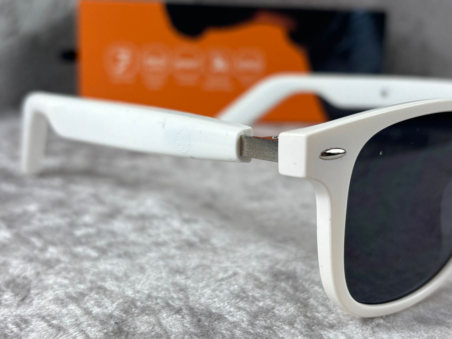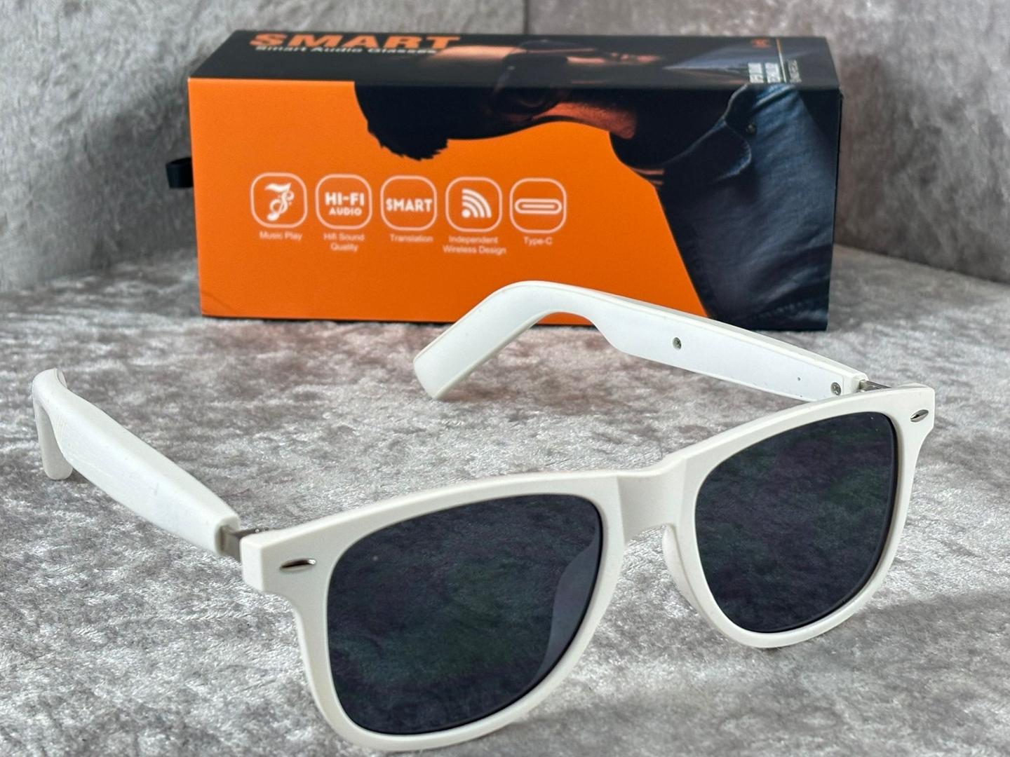 A brand new, unused and boxed pair of white smart glasses combining a classic sunglass design with hands-free audio, built-in call functionality, open-ear sound, and intuitive controls for everyday convenience and on-the-go use.