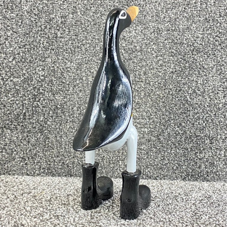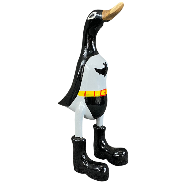 Behold the whimsical fusion of two iconic characters in this hand-carved and painted wooden sculpture of BatDuck. Standing approximately 11 inches in height, with a width and depth of 4 inches, this delightful artwork combines the adventurous spirit of Batman with the charm of everyone's favourite superhero duck.