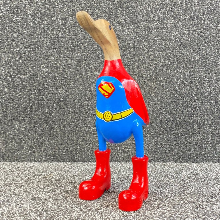 Behold the whimsical charm of SuperDuck brought to life in this handcrafted and painted wooden sculpture. Standing approximately 11 inches in height with a width and depth of 4 inches, this delightful artwork captures the playful spirit and adventurous nature of everyone's favourite superhero duck.