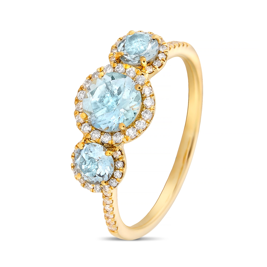 A brand-new, unused, certified 18ct yellow gold natural diamond & aquamarine gemstone round-shaped trio cluster ring, set with three round mixed-cut aquamarine gemstones at the centre & a cluster of brilliant-cut diamonds in a halo setting on the shoulders.