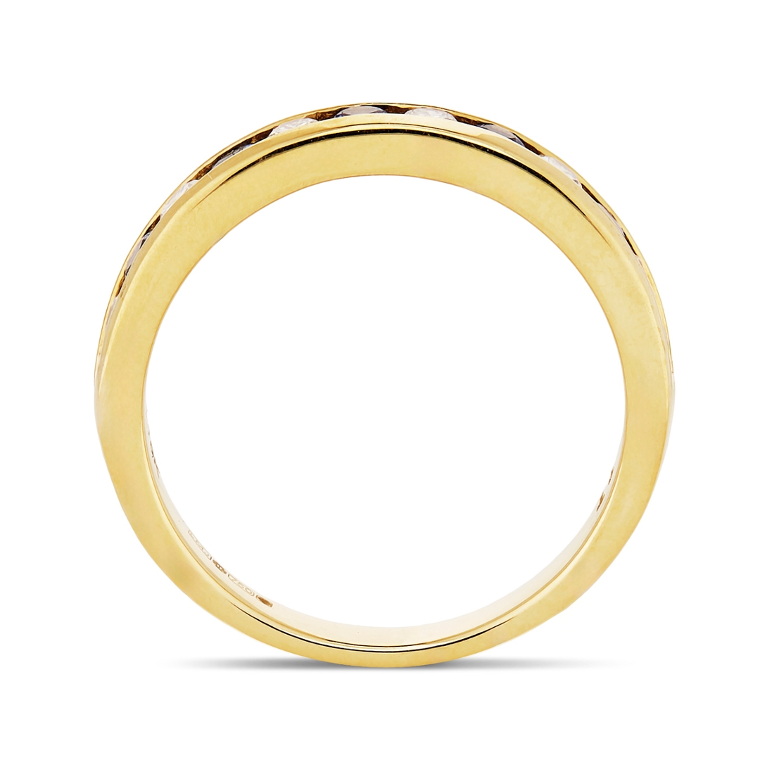 A brand-new, unused certified 18ct yellow gold eternity ring, expertly designed with a harmonious combination of natural blue sapphires and sparkling diamonds. The band is channel-set with seven round, mixed-cut sapphires, weighing a total of 0.43ct; their deep blue colour symbolises loyalty and wisdom. Interspersed between them are six brilliant-cut natural diamonds, totalling 0.27ct, graded G–H for colour and SI1–SI2 for clarity, providing an elegant contrast of vibrant sparkle against the rich hues of the sapphires.
