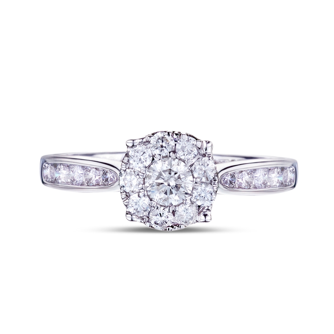 A brand-new, unused, certified natural diamond brilliant-shaped cluster ring set with one brilliant cut diamond to the centre & a cluster of brilliant cut diamonds in a halo setting & to the shoulders, set in 18ct white gold.