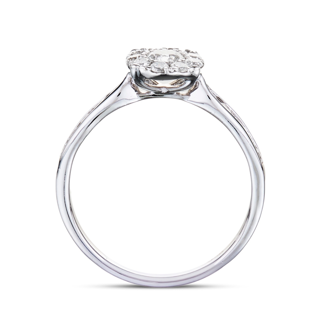 Crafted in 18ct white gold, the 3.16-gram setting enhances the diamonds’ luminosity with its sleek, mirror-like sheen. The elegant proportions and refined craftsmanship make this ring both graceful and timeless, offering enduring comfort and sophistication. The halo design adds depth and dimension, creating a statement piece that remains effortlessly wearable.