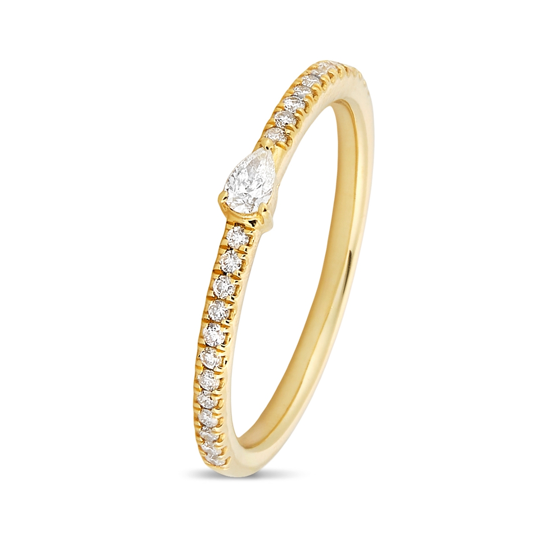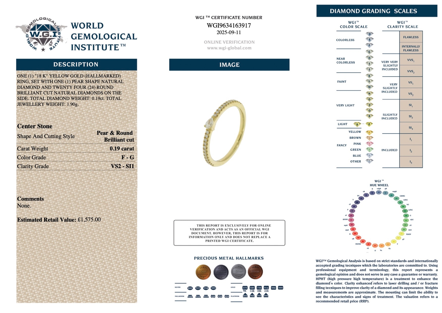 A brand-new, unused 18ct yellow gold natural diamond cluster ring, designed with elegance and subtle sophistication. At the centre sits a pear-cut diamond, delicately balanced to draw the eye, complemented by a sparkling cluster of twenty-four round brilliant-cut diamonds set into the band. Together, these natural stones total 0.19 carat, graded F–G in colour and VS2–SI1 in clarity, ensuring a lively sparkle with a clean, near-colourless brightness. The warm yellow gold band enhances the diamonds' natural radiance, while the refined craftsmanship creates a piece that is both modern and timeless, perfect for adding understated luxury to any occasion.