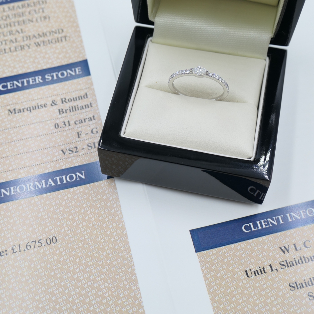 The appeal of natural diamonds lies not only in their beauty but also in their rarity and timeless prestige. Formed deep within the earth over millions of years, each stone represents nature’s finest artistry. The marquise cut, with its unique silhouette, has long been admired for elongating the finger and offering a refined, vintage-inspired style, while the brilliant-cut accents maximise sparkle and light performance. This harmony of cuts ensures the ring catches attention from every angle.