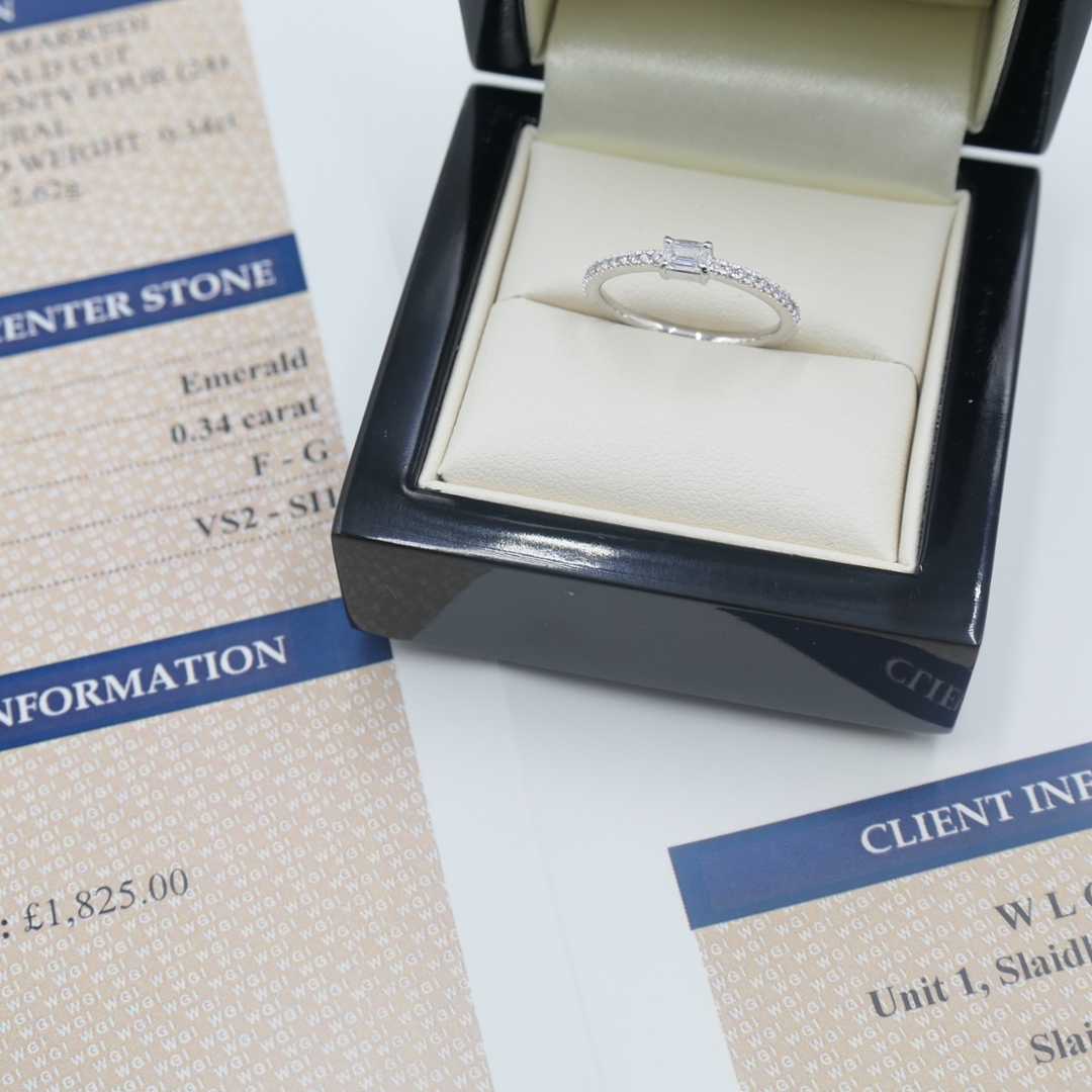 A brand-new, unused, certified natural diamond cluster ring, this refined piece showcases timeless elegance and understated brilliance. At its centre lies an emerald-cut natural diamond, weighing 0.34 carats, graded F–G in colour and VS2–SI1 in clarity. The emerald cut’s sophisticated geometry highlights the diamond’s natural clarity and depth, while smaller brilliant-cut diamonds intricately set within the band add a captivating sparkle from every angle. Together, they create a beautiful balance of structure and radiance, a testament to both modern design and classic luxury.