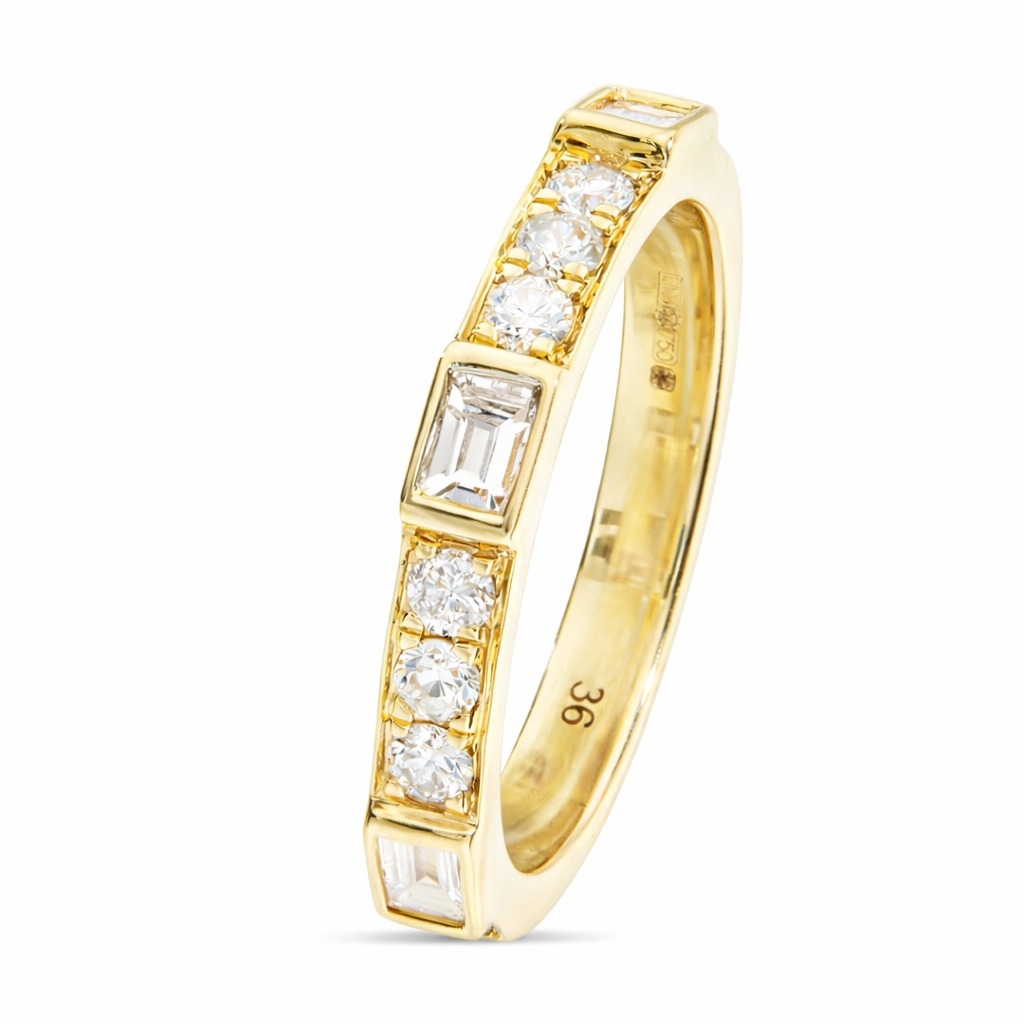 The warm hue of the 18ct yellow gold setting complements the diamonds’ bright luminosity beautifully, adding richness and sophistication to the piece. Every diamond is meticulously positioned to ensure perfect symmetry and maximum light reflection, showcasing both artistry and durability. The contrast between the baguette cuts’ clean geometry and the brilliance of the surrounding stones gives this ring an elegant, timeless appeal.
