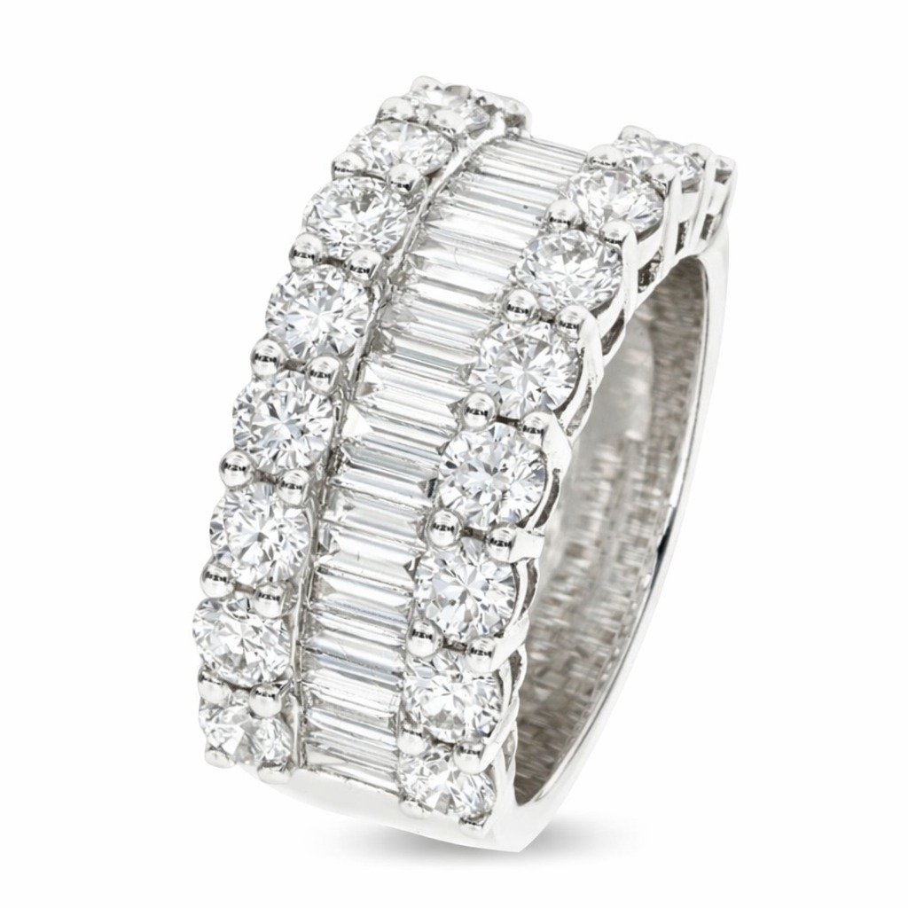 A brand-new, unused certified natural diamond cluster ring that radiates exceptional brilliance and timeless luxury. Exquisitely crafted in 18ct white gold, this striking design features a magnificent 3.00-carat cluster of baguette-cut and brilliant-cut diamonds, each meticulously set to maximise sparkle and symmetry. The interplay between the sleek geometry of the baguette cuts and the fiery brilliance of the round stones creates a captivating display of light, giving the ring a multidimensional allure. Graded G–H in colour and SI1–SI2 in clarity, the diamonds exude purity and vibrance, their natural beauty enhanced by the cool, luminous tones of the white gold setting.