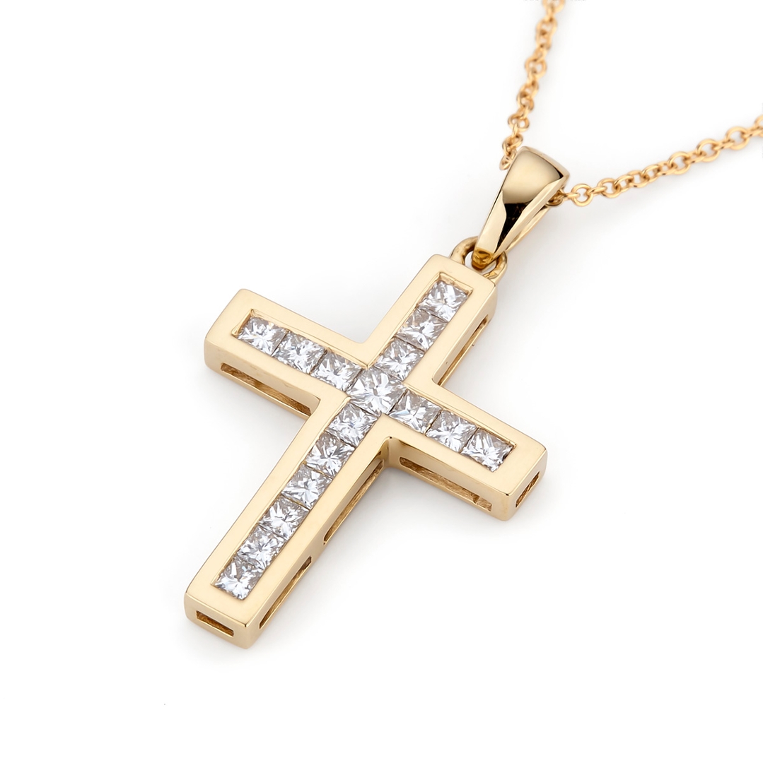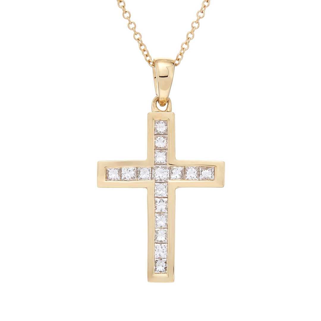 A brand new, unused, certified 18ct yellow gold natural diamond cross pendant, set with a cluster of princess cut diamonds.