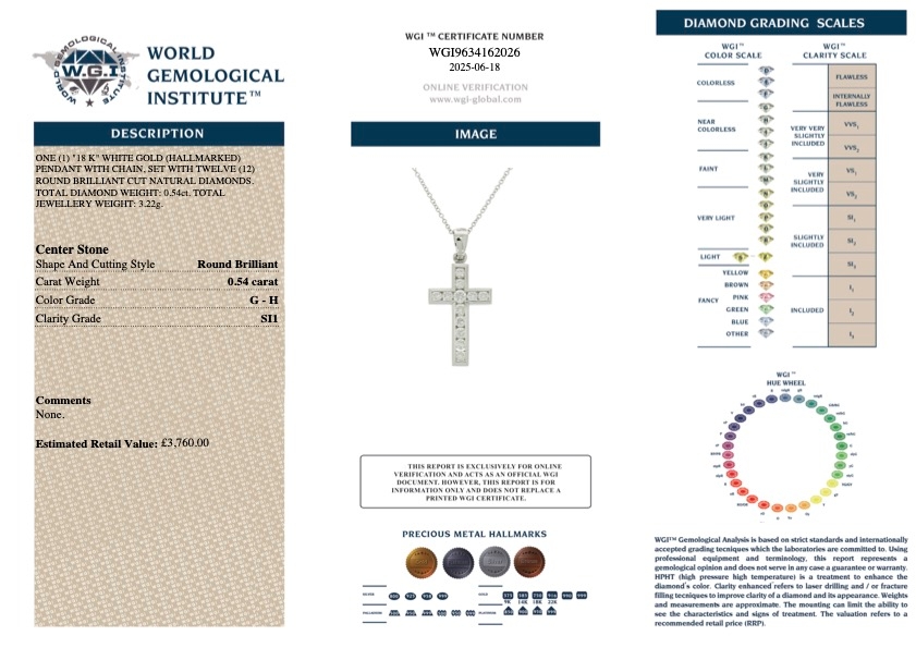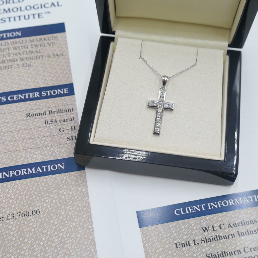 A brand-new, unused, certified 18ct white gold natural diamond cross pendant that blends spiritual significance with refined elegance. Set with a sparkling array of brilliant-cut natural diamonds, this timeless piece totals 0.54 carats. Graded SI1–SI2 in clarity and G–H in colour, each diamond has been carefully selected for its lively brilliance and clean, radiant appearance.