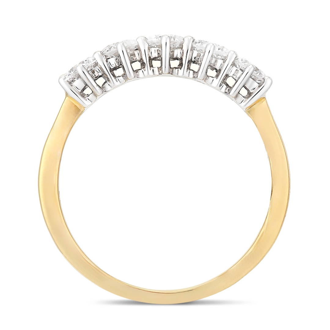 A brand-new, unused 18ct yellow and white gold five stone eternity ring, beautifully set with natural round brilliant-cut diamonds totalling 0.97 carat. The stones are graded G–H in colour and SI1–SI2 in clarity, offering a lively sparkle with a bright, near-colourless hue that complements the classic design. Each diamond has been carefully selected for its radiance and is securely mounted in white gold, while the band is crafted in yellow gold, providing a warm, elegant contrast. The combination creates a timeless look, ideal for marking life’s milestones or as a luxurious everyday piece.