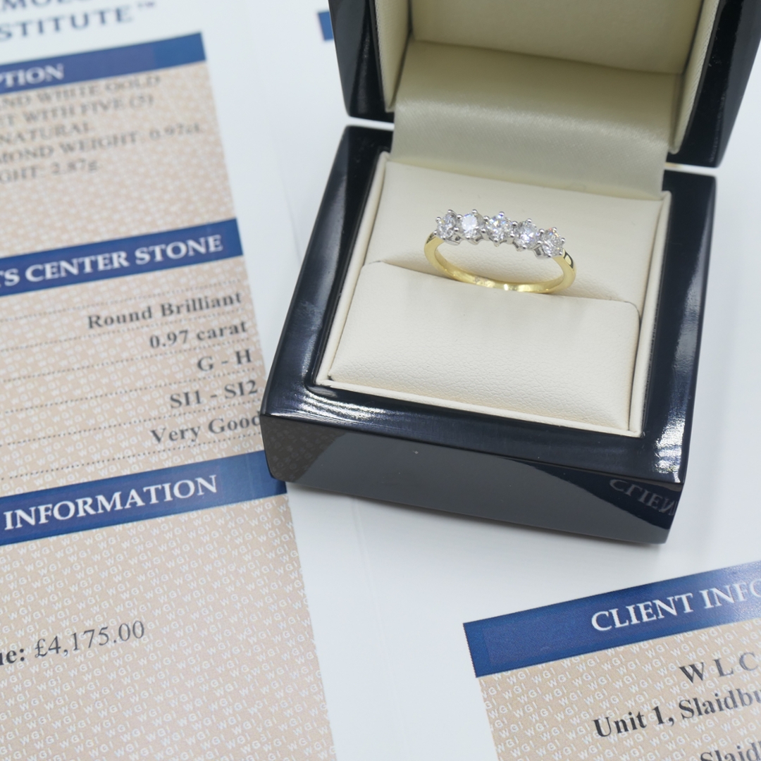 A brand-new, unused 18ct yellow and white gold five stone eternity ring, beautifully set with natural round brilliant-cut diamonds totalling 0.97 carat. The stones are graded G–H in colour and SI1–SI2 in clarity, offering a lively sparkle with a bright, near-colourless hue that complements the classic design. Each diamond has been carefully selected for its radiance and is securely mounted in white gold, while the band is crafted in yellow gold, providing a warm, elegant contrast. The combination creates a timeless look, ideal for marking life’s milestones or as a luxurious everyday piece.