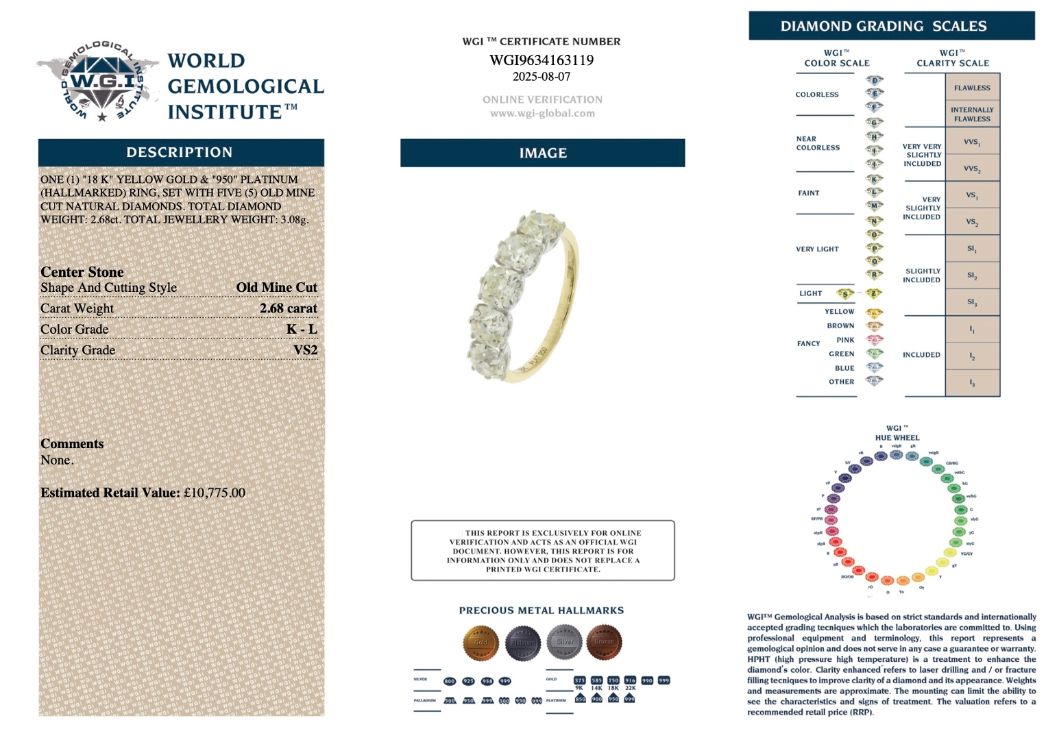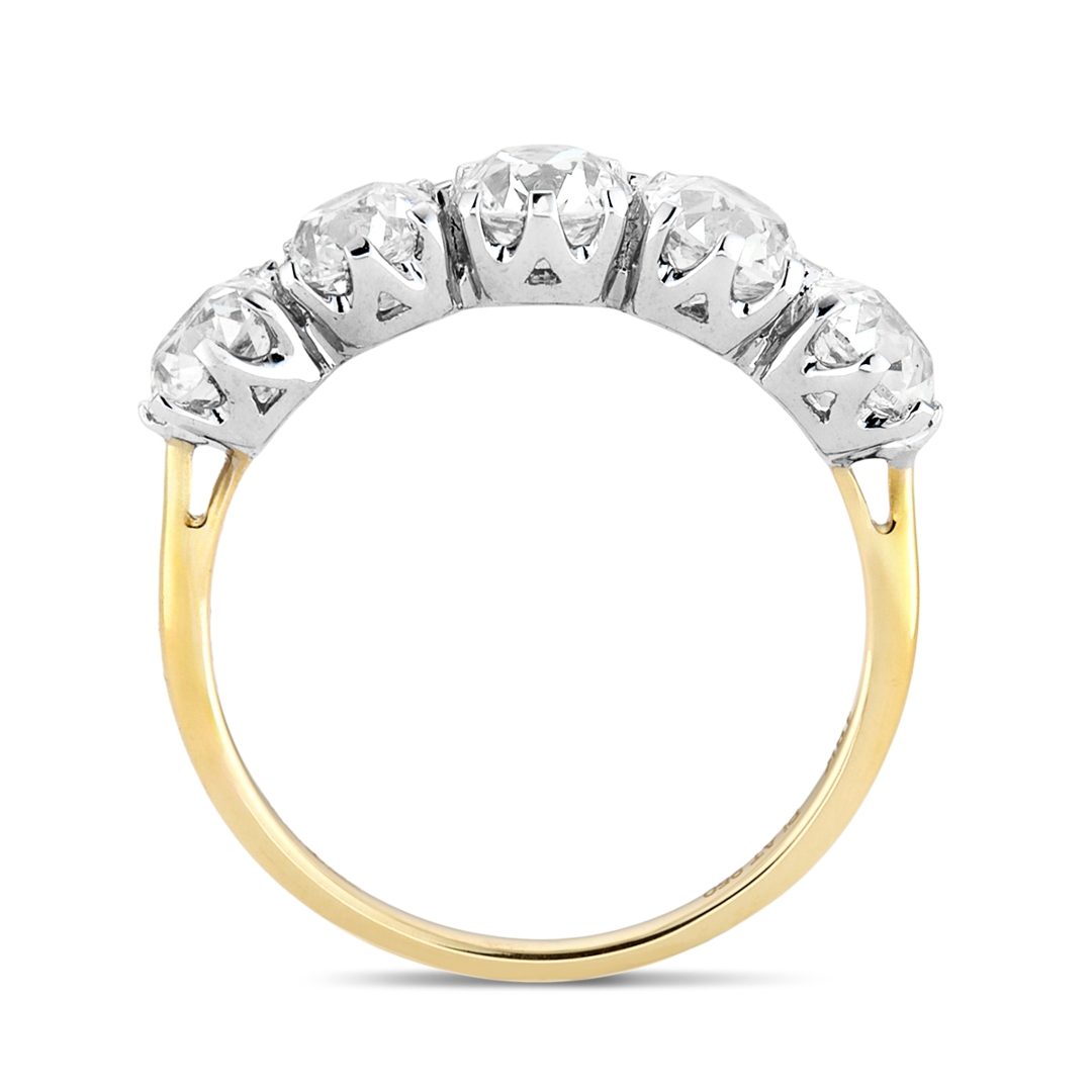 A brand-new, unused, certified platinum and 18ct yellow gold five-stone eternity ring, this exceptional piece is set with five old mine-cut natural diamonds of impressive character, weighing a total of 2.68 carats. Each diamond is graded VS2 in clarity and K–L in colour, chosen for its individuality and charm. The old mine cut, with its broad facets and antique sparkle, possesses a unique depth of fire that is distinct from modern cuts, offering a sense of history and timeless elegance. The dual tones of platinum and yellow gold provide both strength and warmth, enhancing the natural radiance of the stones and giving the ring a refined, enduring appeal.