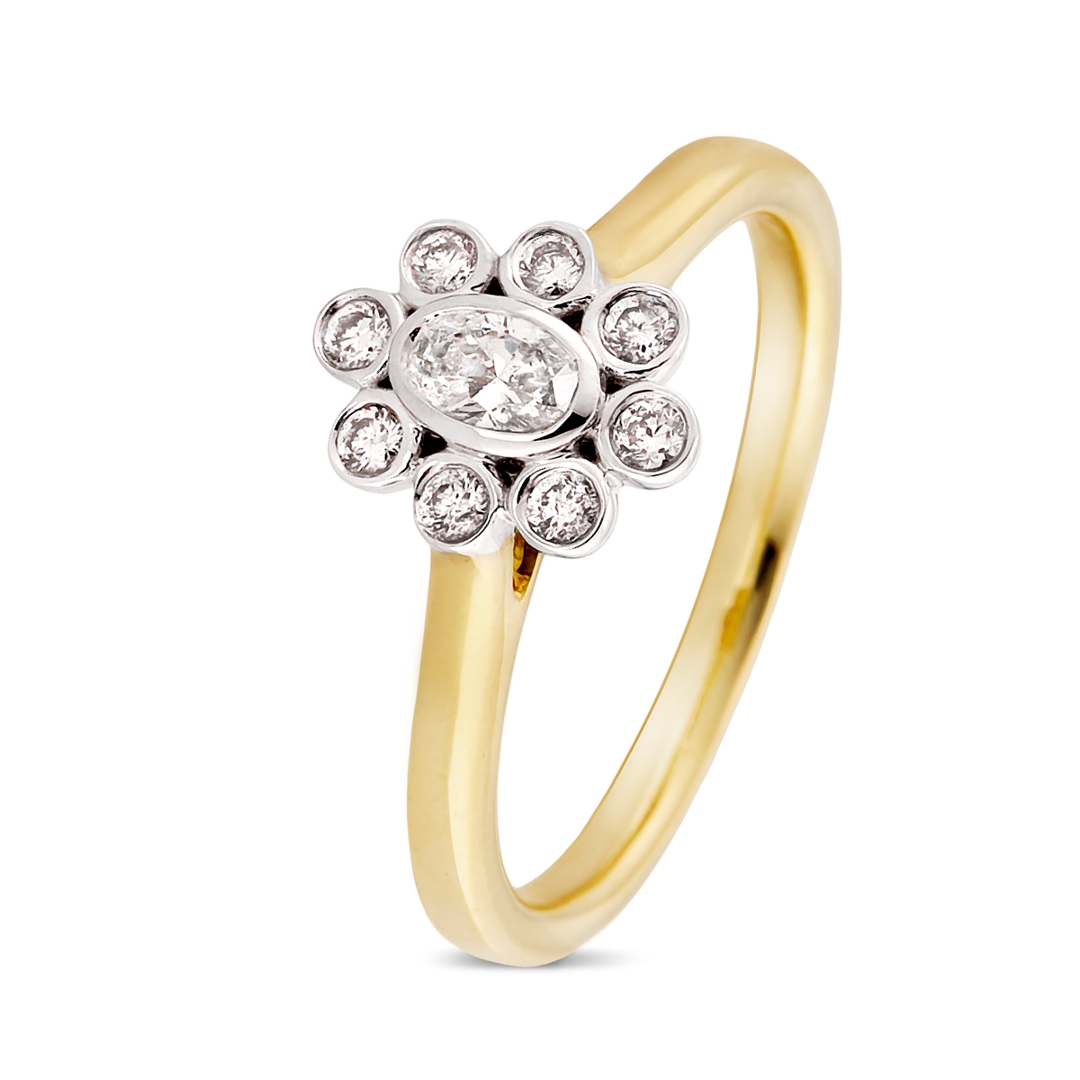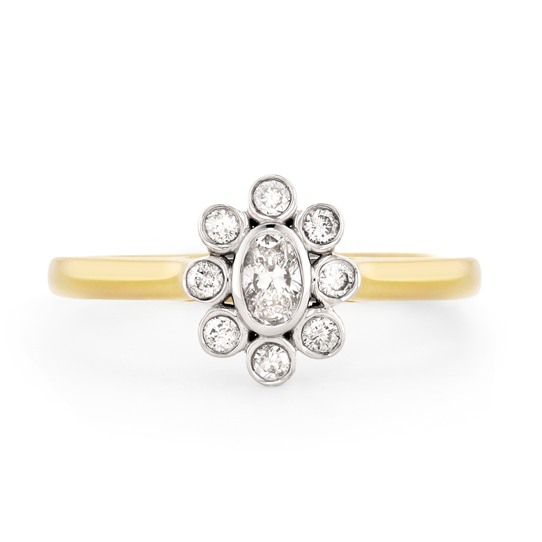 A brand-new, unused 18ct yellow and white gold natural diamond flower-shaped cluster ring, designed with a central oval-cut diamond surrounded by eight brilliant-cut stones arranged in a halo to form a delicate floral silhouette. The total diamond weight is 0.35 carat, with a G–H colour grade and SI1–SI2 clarity, ensuring a bright, lively sparkle that beautifully contrasts against the yellow gold band. The white gold setting around the stones enhances their brilliance, while the elegant, timeless design makes this piece versatile for both everyday wear and special occasions. Weighing 3.53g, it carries a comfortable yet substantial presence on the hand.