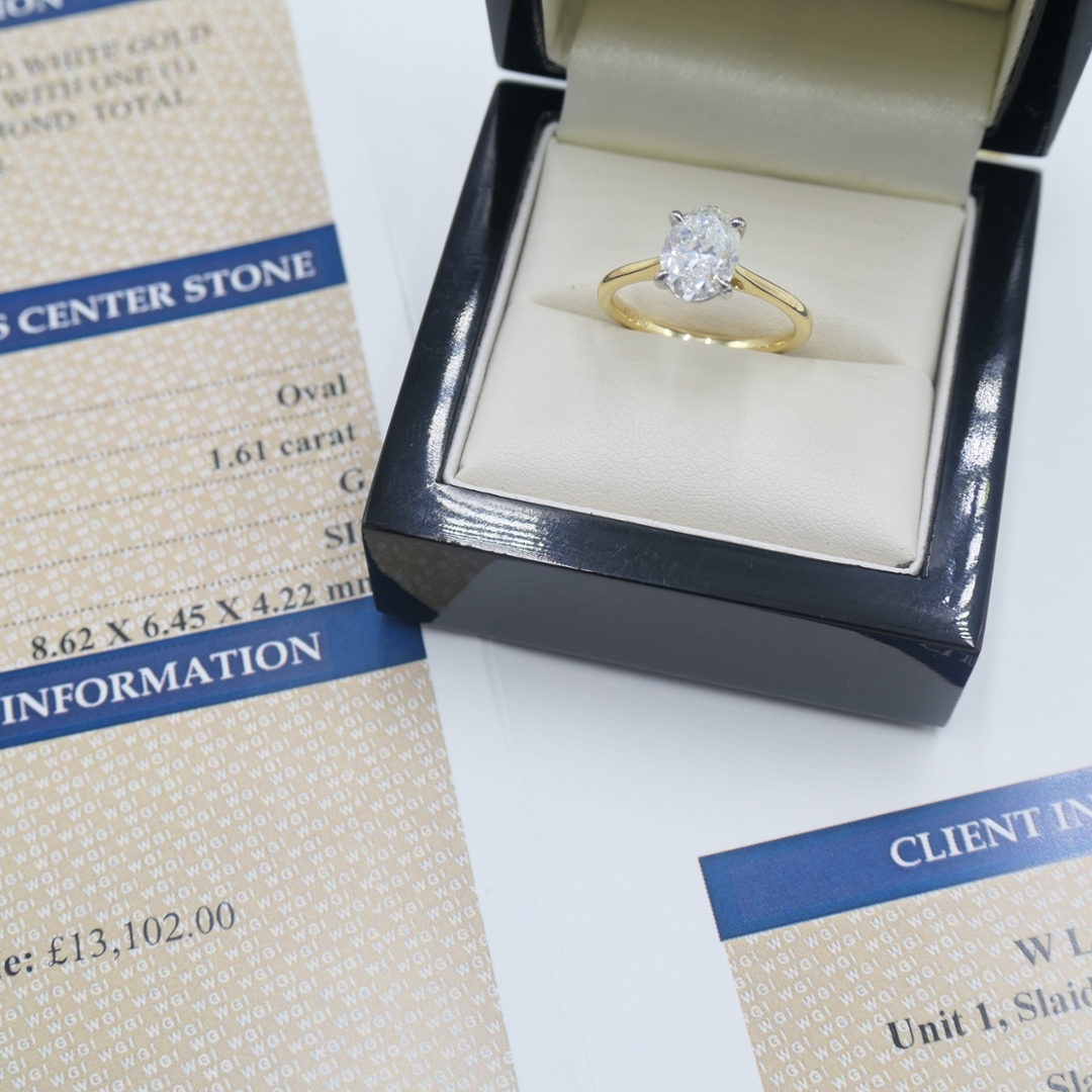 A brand-new, unused, certified 18ct yellow and white gold natural diamond solitaire engagement ring that reflects timeless craftsmanship and enduring beauty. At its centre lies a 1.61ct oval cut diamond, carefully selected for its graceful shape and radiant sparkle. With a clarity grade of SI2 and a colour grade of G, the diamond offers a captivating brilliance that strikes a balance between size, presence, and charm. Its natural origin enhances both its rarity and desirability, ensuring it remains a treasured choice.