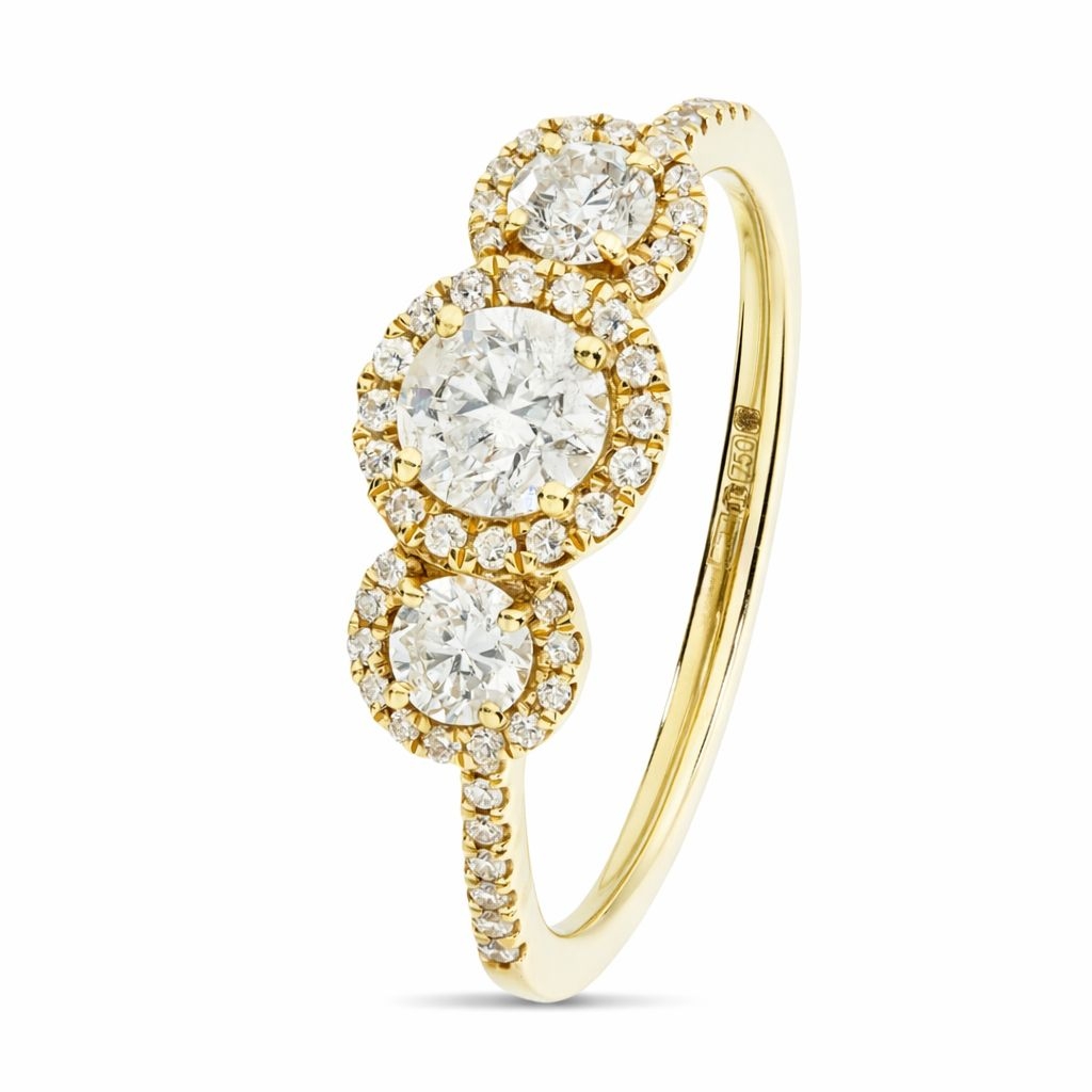 A brand-new, unused, certified natural diamond round-shaped trio cluster ring, set with three brilliant cut diamonds to the centre & a cluster of brilliant-cut diamonds in a halo setting & to the shoulders, set in 18ct yellow gold.
