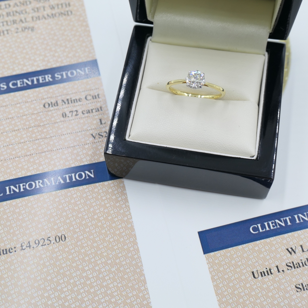 A brand-new, unused certified 18ct yellow gold and platinum engagement ring featuring a captivating round-cut natural diamond. The centre stone weighs 0.72 carats and is graded VS2 for clarity, ensuring fine internal quality with excellent brilliance. Its L colour grade gives the diamond a warm and distinctive tone, enhancing its antique charm and individuality. Set securely within a platinum mount against the rich backdrop of yellow gold, the contrast between metals highlights the stone’s character, making this ring a striking and elegant choice.
