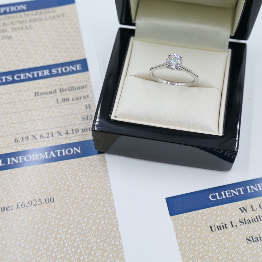 A brand-new, unused, certified platinum natural diamond solitaire engagement ring that captures the essence of refined simplicity. At the centre rests a 1.00ct brilliant cut diamond, selected for its timeless appeal and radiant sparkle. With a clarity grade of SI2 and a colour grade of H, the stone offers a harmonious balance of brightness and character, ensuring it catches the light beautifully from every angle. As a natural diamond, it embodies authenticity and rarity, qualities that heighten its desirability.