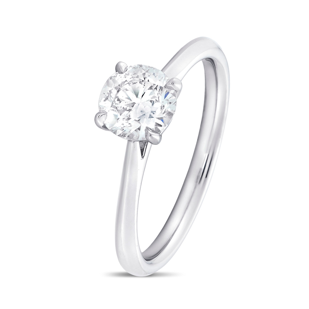A brand-new, unused, certified natural diamond solitaire engagement ring, set with one brilliant cut diamond at the centre, set in platinum.