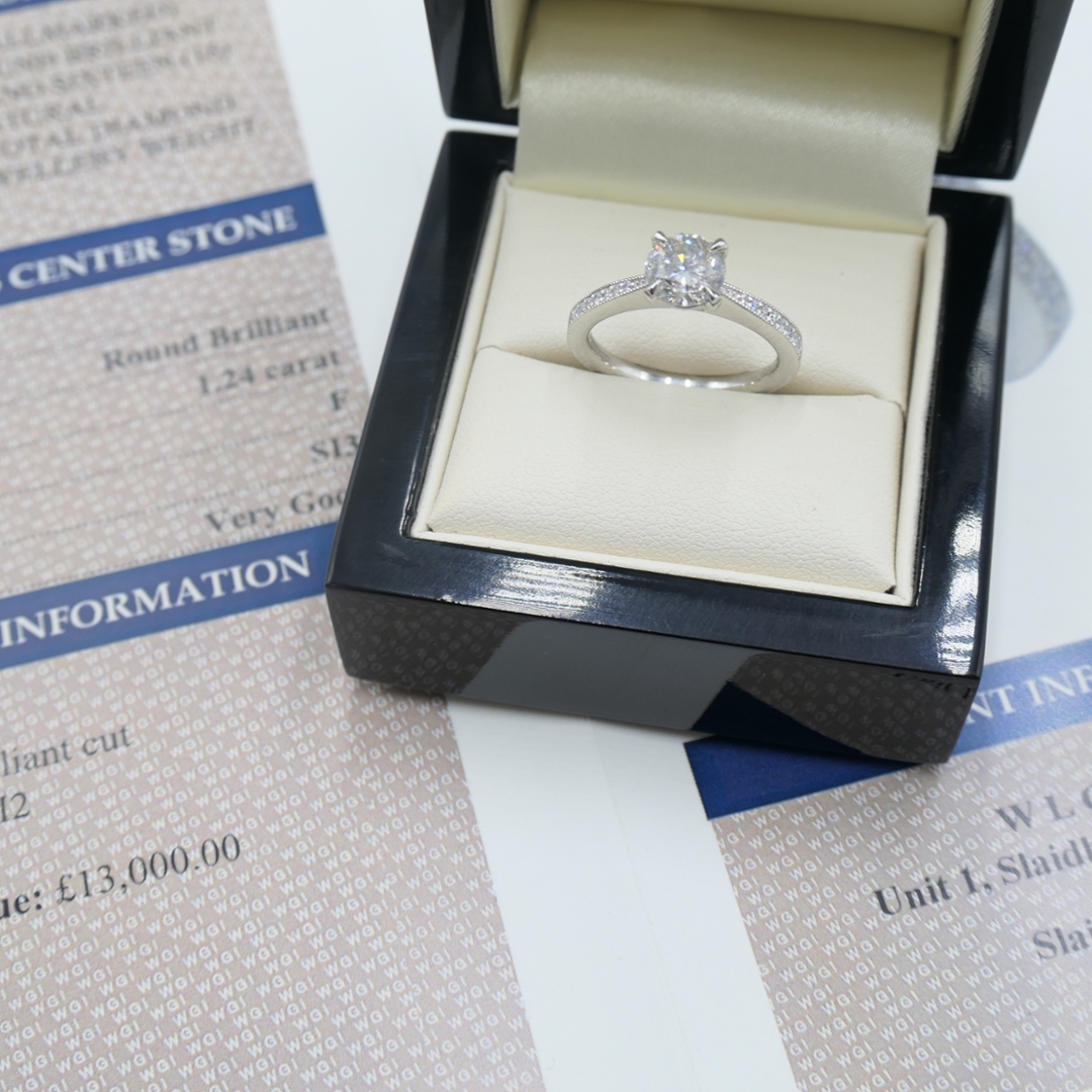 A brand-new, unused, certified platinum natural diamond solitaire engagement ring that perfectly blends refined sparkle with timeless sophistication. At its centre is a dazzling 1.24ct brilliant-cut natural diamond, graded F for colour and SI3 for clarity, offering a bright, near-colourless shine that draws the eye and radiates pure elegance. Enhancing the centrepiece is a graceful cluster of brilliant-cut diamonds set along the shoulders, totalling 0.12ct. These accent stones, graded G–H for colour and SI1–SI2 for clarity, add an extra layer of brilliance, enhancing the ring’s light-catching appeal without distracting from its striking centre.