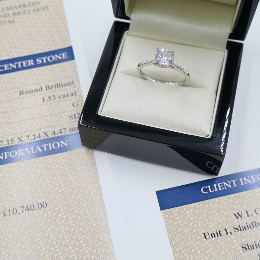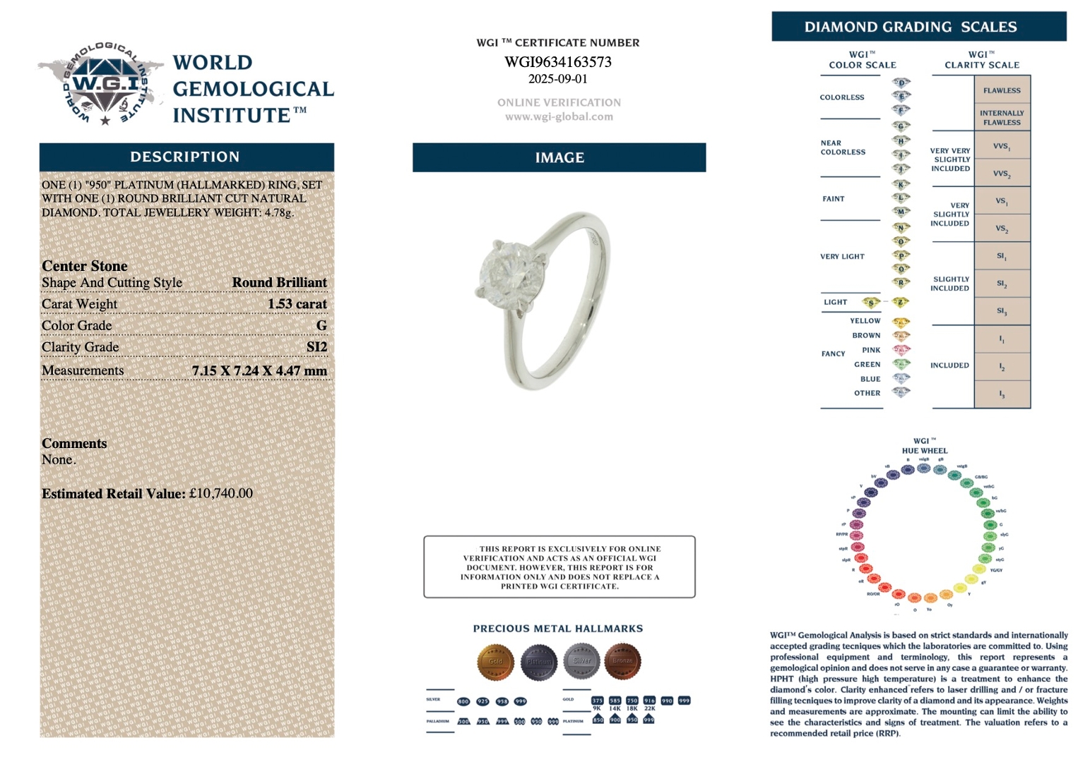 A brand-new, unused, certified platinum natural diamond solitaire engagement ring that radiates classic elegance and lasting appeal. The central focus is a 1.53-carat brilliant-cut diamond, carefully chosen for its impressive size and sparkle. With SI2 clarity and a colour grade of G, the diamond displays lively brilliance and warmth, ensuring it catches the light beautifully from every angle. Its natural origin further enhances its rarity, making it a prized and meaningful choice.