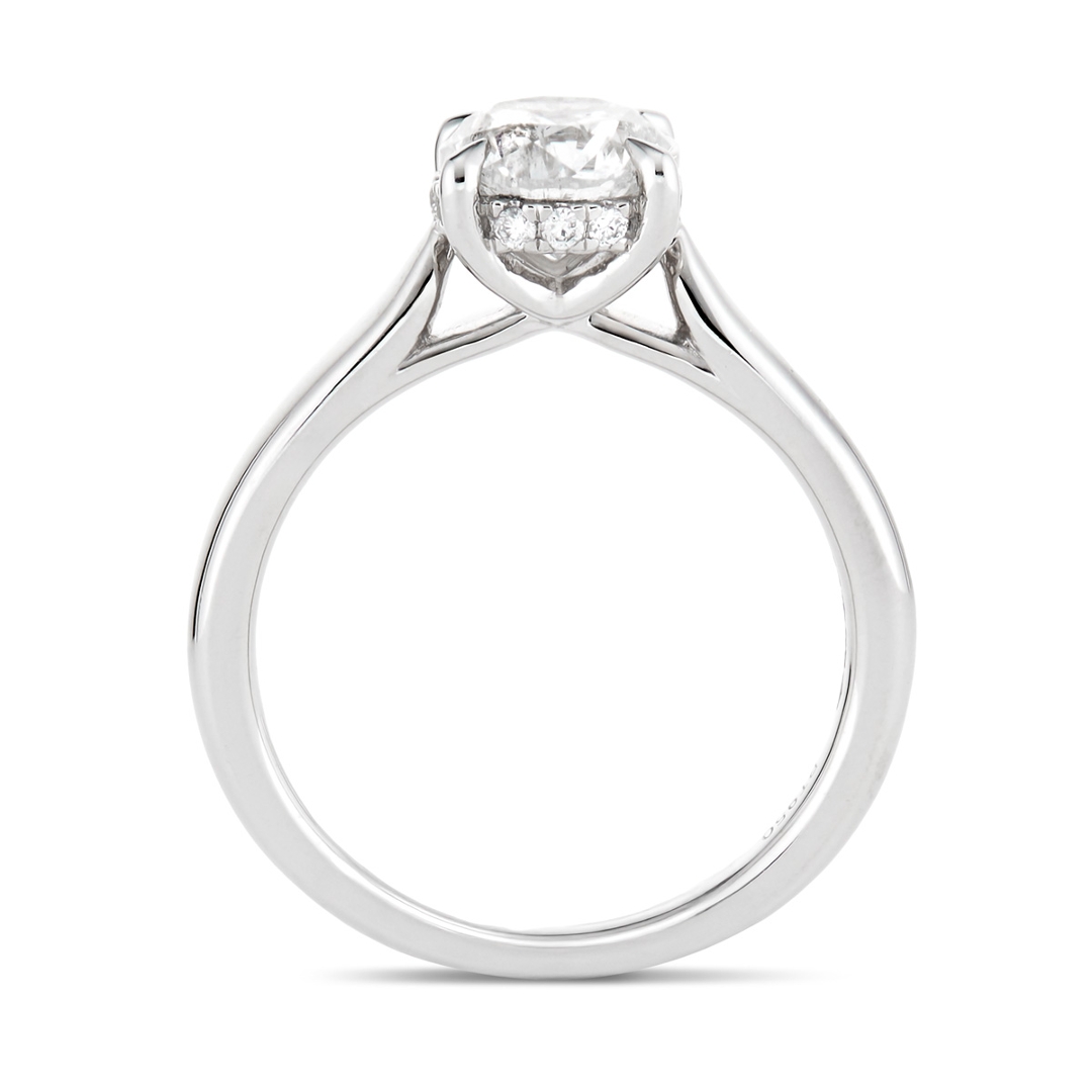 A brand new, unused, certified natural diamond solitaire engagement ring, set with one brilliant cut diamond at the centre & a cluster of brilliant cut diamonds around the primary setting, set in platinum.