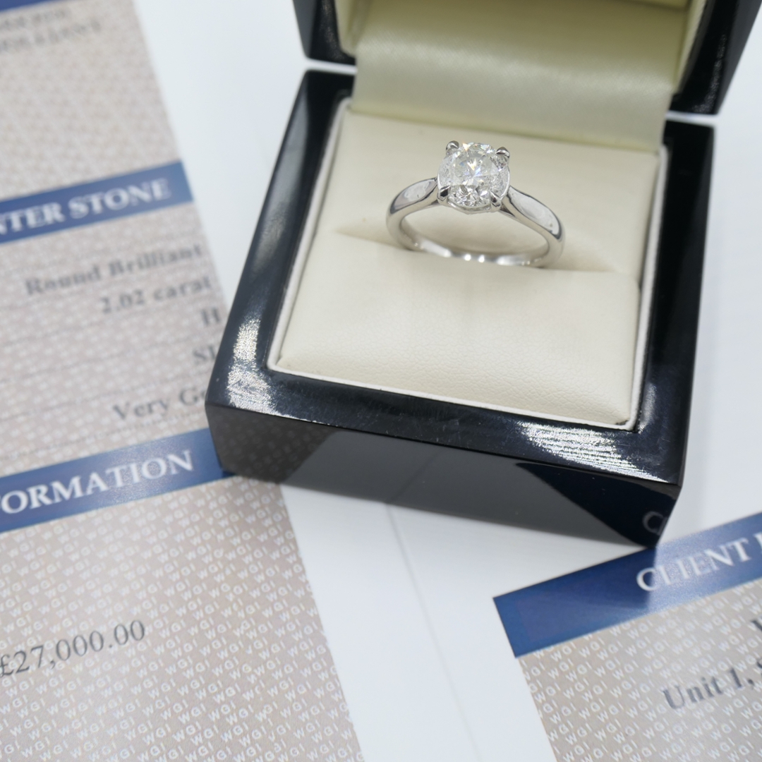 A brand-new, unused, certified platinum natural diamond solitaire engagement ring that delivers breathtaking simplicity with undeniable impact. At its centre sits a stunning 2.02ct brilliant-cut natural diamond, graded H for colour and SI3 for clarity. With its generous size and warm, lively sparkle, this diamond commands attention while maintaining an elegant, timeless charm. The expertly cut facets ensure beautiful light reflection, offering a dazzling display of brilliance and fire with every movement.