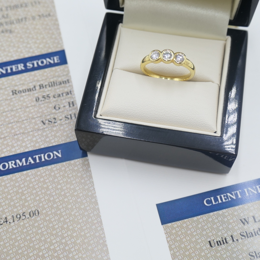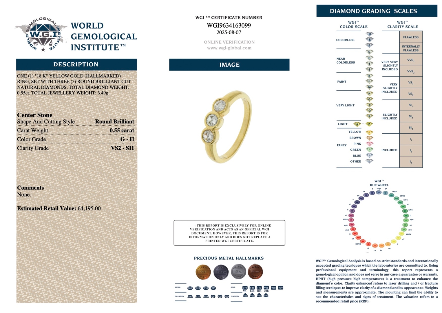 A brand-new, unused, certified 18ct yellow gold three-stone cluster ring, this exquisite piece is set with three natural brilliant-cut diamonds that total 0.55ct. With their bright G-H colour and clarity grading of VS2-SI1, these diamonds radiate a lively brilliance that captures light beautifully, offering both fire and sparkle. The cluster arrangement lends the ring an elegant balance, with each stone carefully selected to complement the others, resulting in a refined and harmonious display of natural beauty.