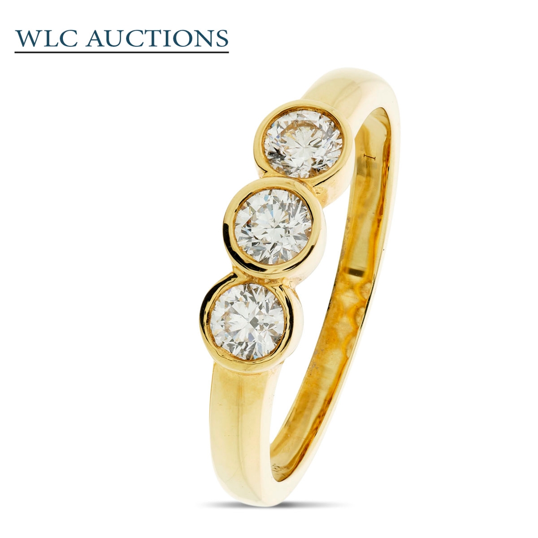 A brand new, unused, certified natural diamond three-stone cluster ring set with three brilliant cut diamonds, set in 18ct yellow gold.