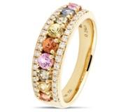 A brand new, unused, certified 18ct yellow gold natural diamond three-stone cluster ring set with one oval cut diamond to the centre, two brilliant cut diamonds to the sides & a cluster of brilliant cut diamonds to the shoulders.