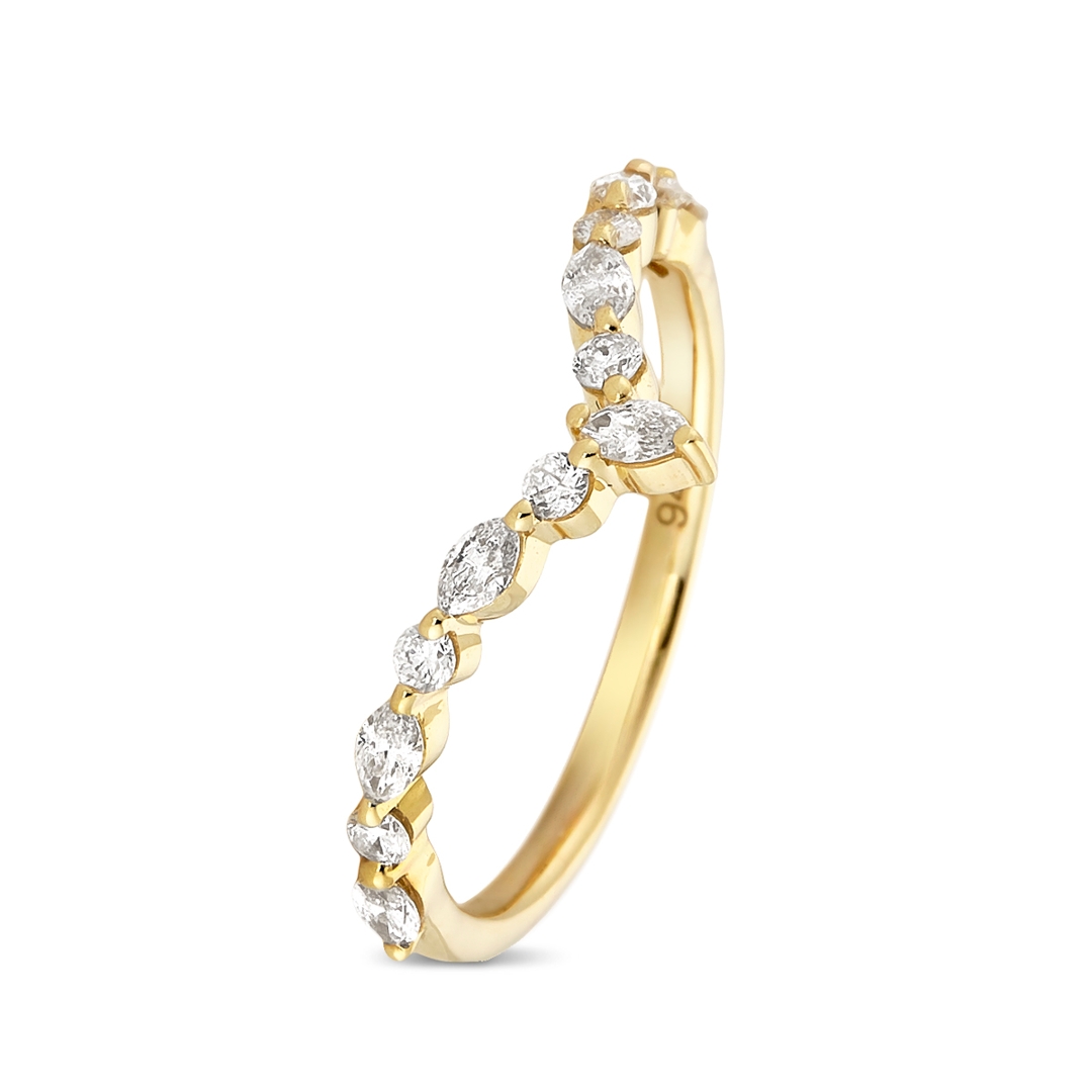 A brand-new, unused, certified 18ct yellow gold natural diamond wishbone eternity ring, set with seven marquise-cut & six brilliant-cut diamonds.