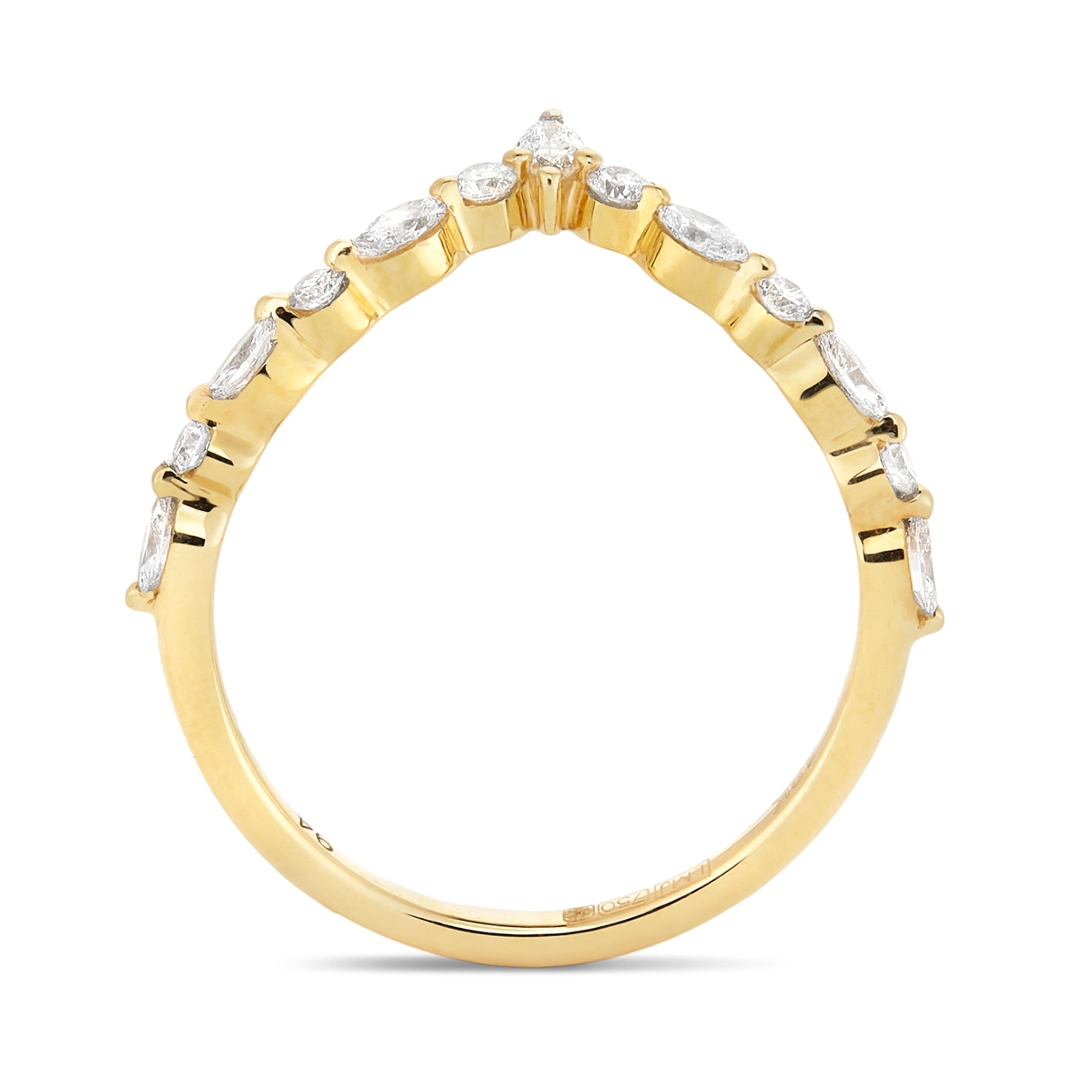 A brand-new, unused 18ct yellow gold natural diamond wishbone eternity ring, designed with elegance and unique character. The band is beautifully set with a combination of seven marquise-cut diamonds and six round brilliant-cut diamonds, totalling 0.37 carats. The stones are graded F–G in colour and VS2–SI1 in clarity, offering a bright, near-colourless sparkle that enhances the distinctive wishbone shape. Crafted in rich yellow gold with a total weight of 1.79g, the ring has a refined yet eye-catching presence, making it ideal as a wedding or anniversary ring, or as a striking addition to any fine jewellery collection.