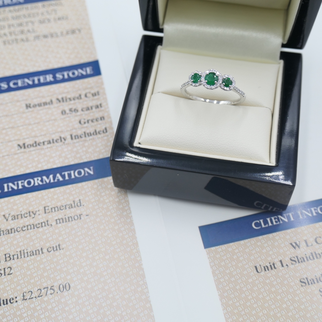 A brand new, unused, certified natural diamond & emerald gemstone round-shaped trio cluster ring, set with three round mixed-cut emerald gemstones to the centre & a cluster of brilliant-cut diamonds in a halo setting & to the shoulders, set in platinum.