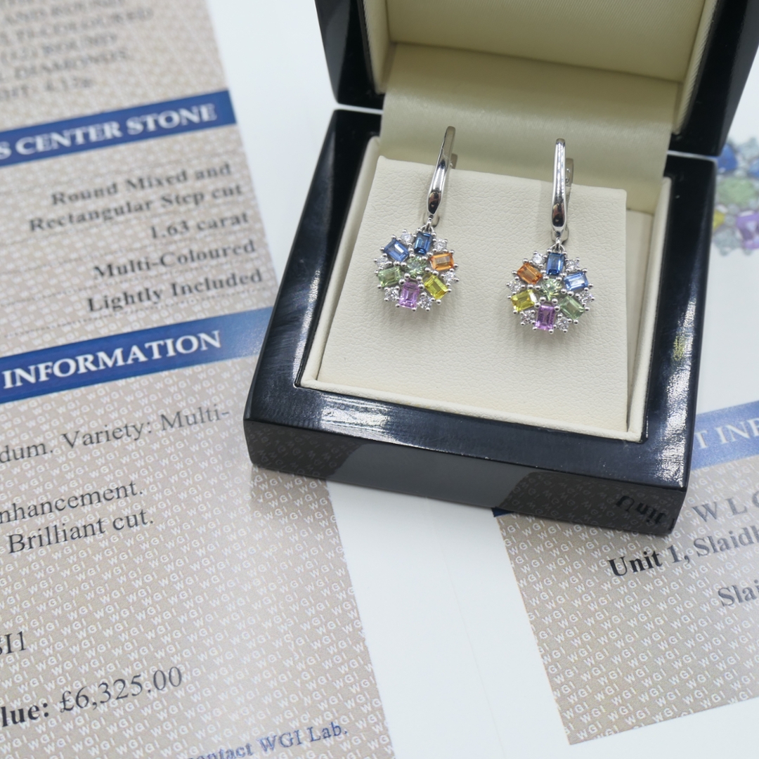 A brand-new, unused certified pair of 18ct white gold droplet earrings that combine refined elegance with a captivating burst of colour. These beautifully crafted earrings are set with 1.63ct of round, mixed-cut, and rectangular step-cut multi-coloured sapphires, each gemstone carefully chosen for its vivid tone, fine clarity, and brilliant sparkle. The arrangement of varied shapes and colours creates a striking visual harmony, enhanced by 0.25ct of natural, brilliant-cut diamonds, graded G-H in colour and VS2-SI1 in clarity. The diamonds’ crisp radiance contrasts perfectly with the cool sheen of the white gold, while the droplet design allows the gemstones to move gracefully and catch the light from every angle.