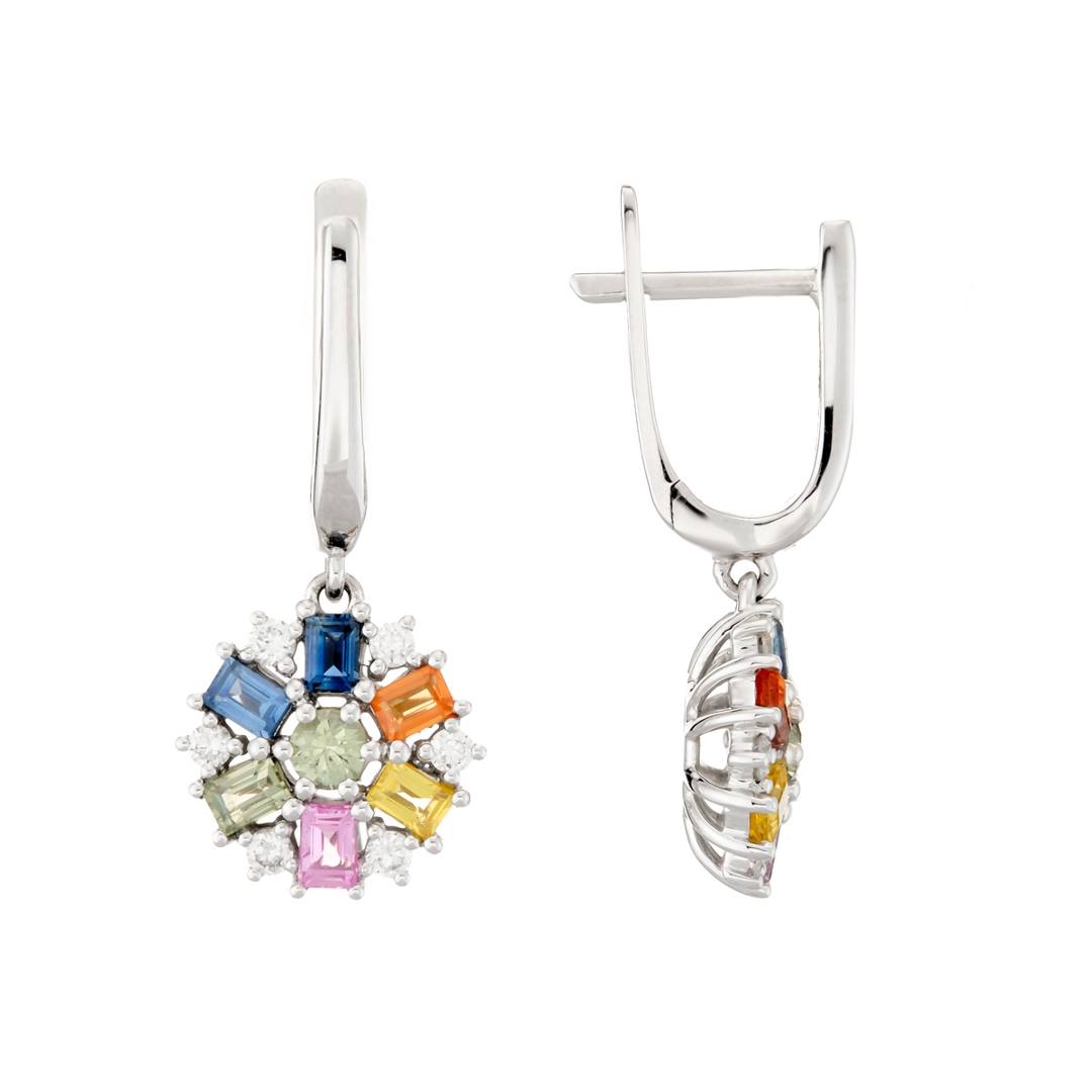 A brand-new, unused certified pair of natural diamond & multi-coloured sapphire gemstone droplet earrings, set with a cluster of round mixed-cut and rectangular step-cut multi-coloured sapphire gemstones & a cluster of brilliant-cut diamonds, set in 18ct white gold.