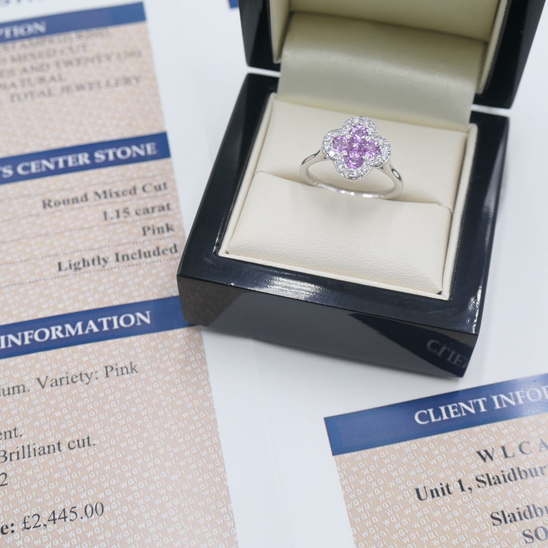 A brand-new, unused certified platinum cluster ring designed in a charming four-leaf clover motif, set with natural pink sapphires and diamonds. At the centre are five round mixed-cut pink sapphires, weighing a combined 1.15ct, their vibrant yet soft hue symbolising love, fortune and individuality. These stones are untreated, adding to their rarity and natural allure. Surrounding the sapphires is a halo of round brilliant-cut natural diamonds, weighing 0.32ct in total. With a colour grade of F–G and clarity between SI1 and SI2, the diamonds sparkle brightly, enhancing the delicate pink sapphires with brilliance and contrast.