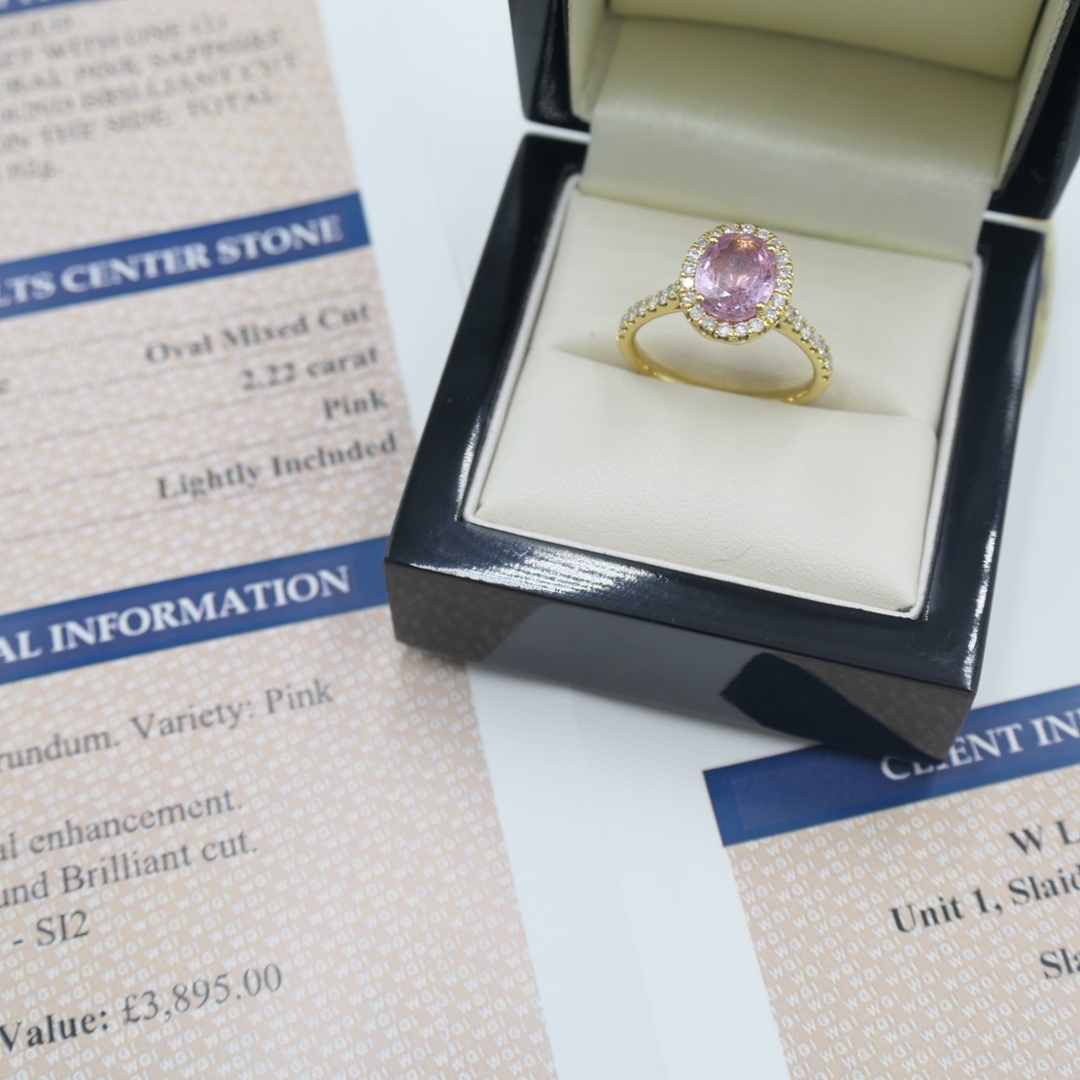 A brand-new, unused certified 18ct yellow gold cluster ring that radiates elegance, featuring a captivating natural pink sapphire as its centrepiece. The oval mixed-cut sapphire weighs an impressive 2.22ct and displays a refined pink hue, a colour long cherished for its rarity and association with romance, grace, and prosperity. Surrounding this gemstone, thirty-six brilliant-cut natural diamonds form a halo and extend gracefully onto the shoulders of the ring. With a combined diamond weight of 0.49ct, each stone is graded F–G in colour and SI1–SI2 in clarity, offering a luminous sparkle that perfectly complements the sapphire's vivid charm.