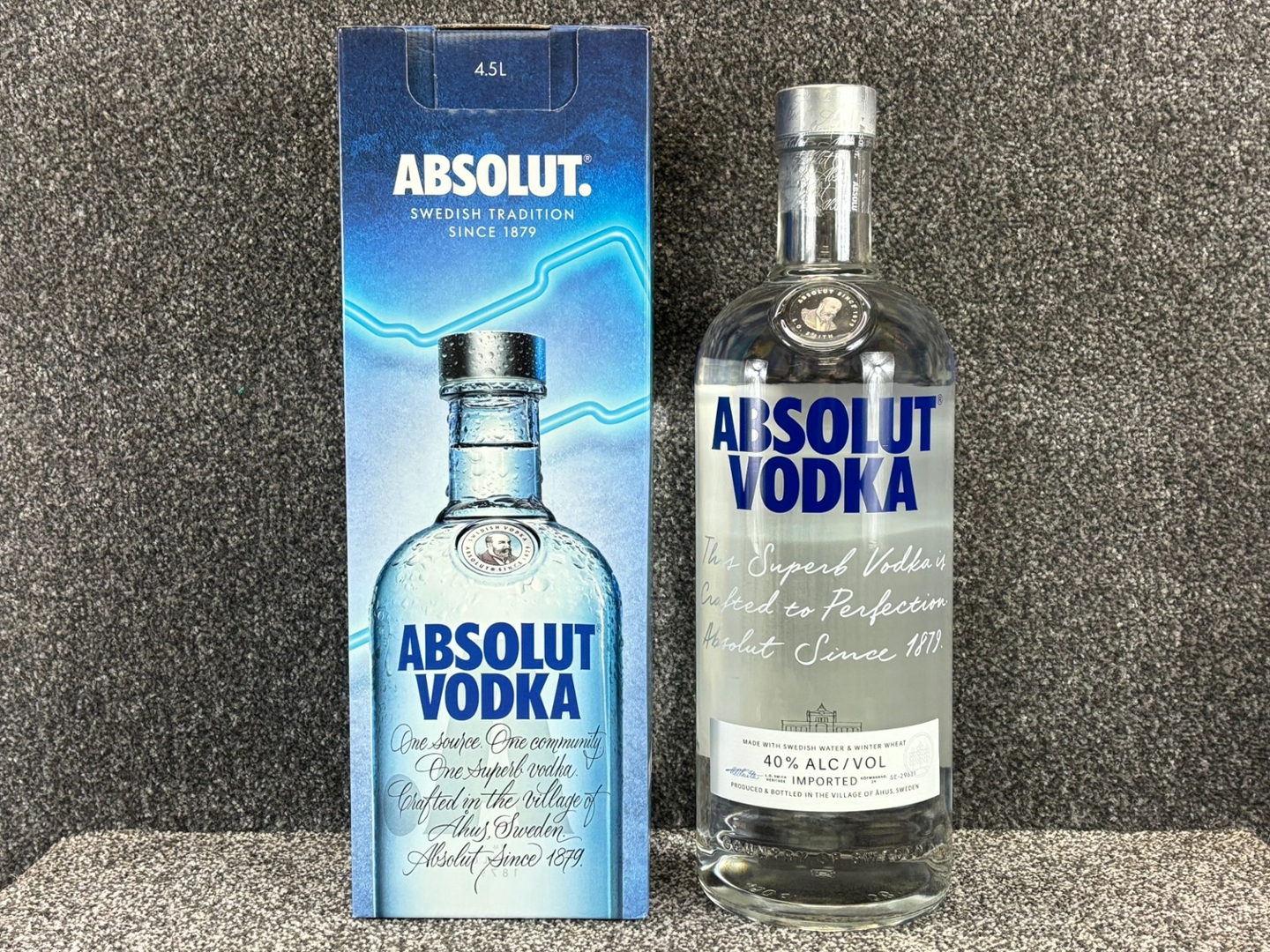 A 4.5-litre bottle of Absolut Vodka, presented here in its impressive large-format box exactly as shown in the image. The packaging features the classic frosted-bottle design, the bold ABSOLUT VODKA branding and the signature script emphasising its Swedish heritage since 1879. The box clearly states the 4.5L volume at the top, confirming this as the giant, party-sized edition — a real statement piece for any event or collection.