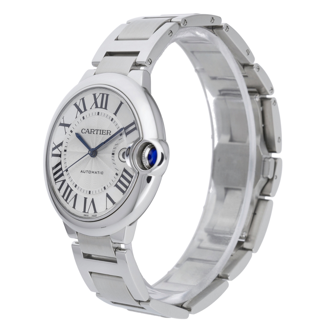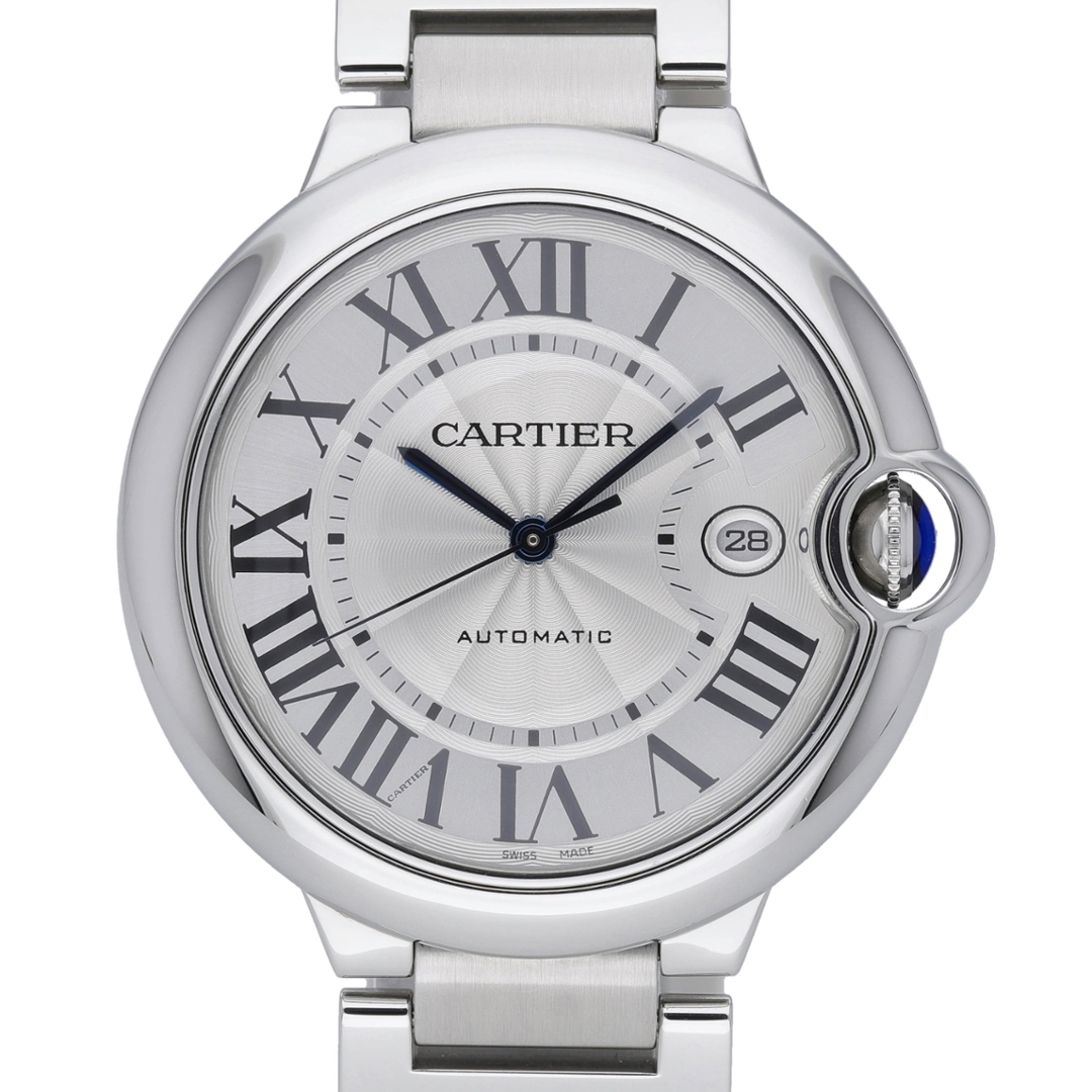 A Cartier Ballon Bleu W69012Z4, this 42mm stainless-steel model captures the elegant curvature and signature design language that have made the Ballon Bleu one of Cartier’s most recognisable creations. The silver guilloché dial, accented with bold Roman numerals and blued-steel hands, brings exceptional clarity and refinement, while the integrated crown guard and sapphire cabochon deliver the distinctive silhouette collectors continue to admire. Its steel bracelet complements the case perfectly, offering a sleek and versatile aesthetic suitable for both daily wear and dress occasions.