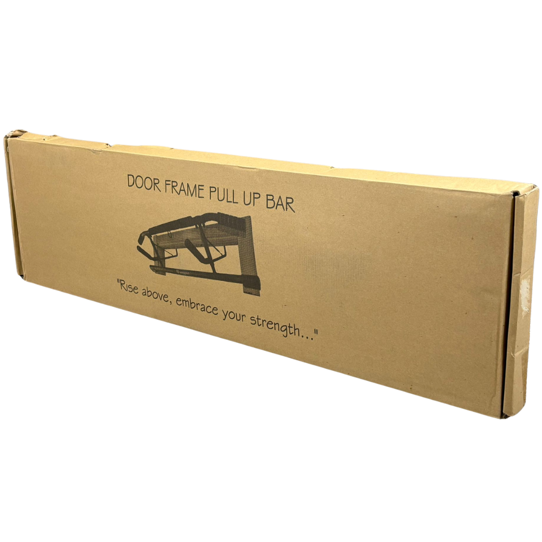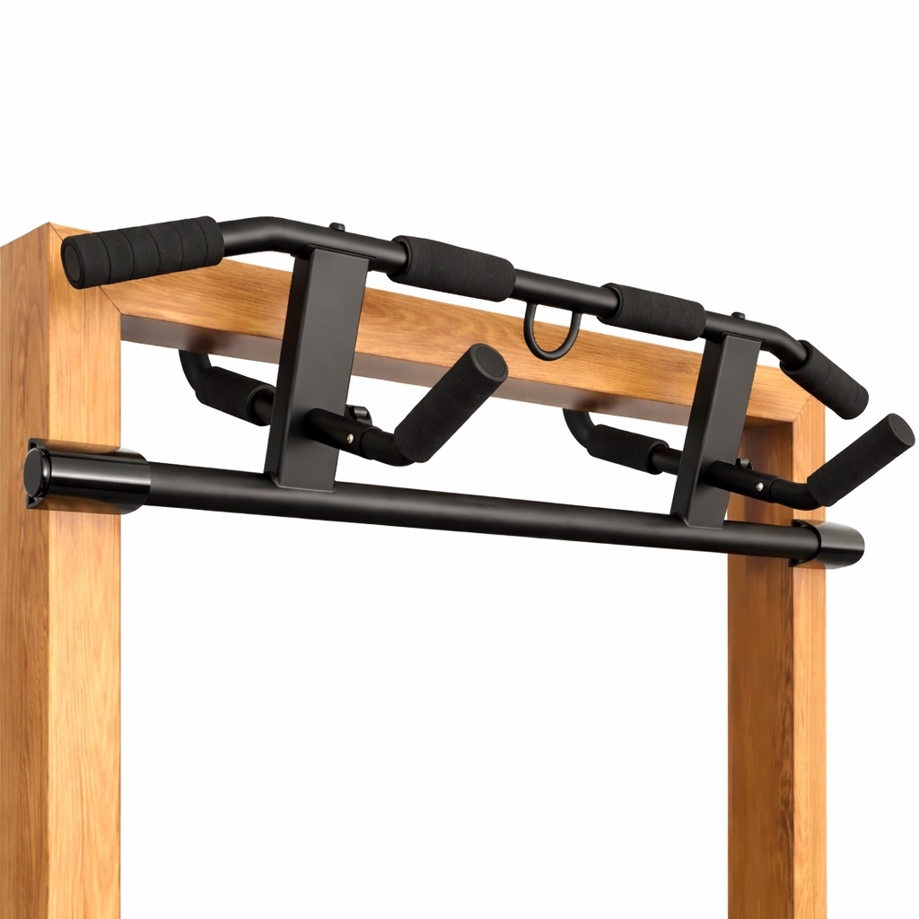 An Adjustable Door Frame Pull Up Bar with Multi-Grip Handles & Foam Protection Pads.