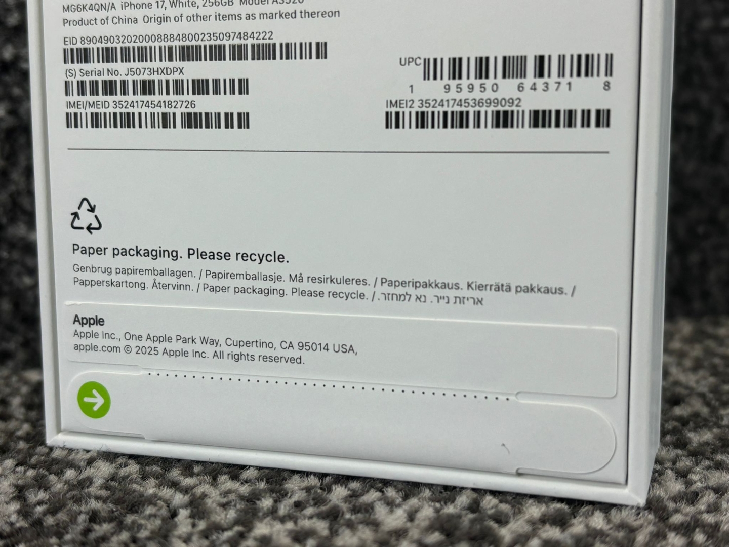 A brand new, factory-sealed smartphone labelled as an Apple iPhone 17 in white with 256GB of storage. The device is presented in unopened retail-style packaging and is marked as SIM-free and unlocked, allowing use with any compatible network. The box includes the handset and a USB-C charging cable, as stated on the rear label.