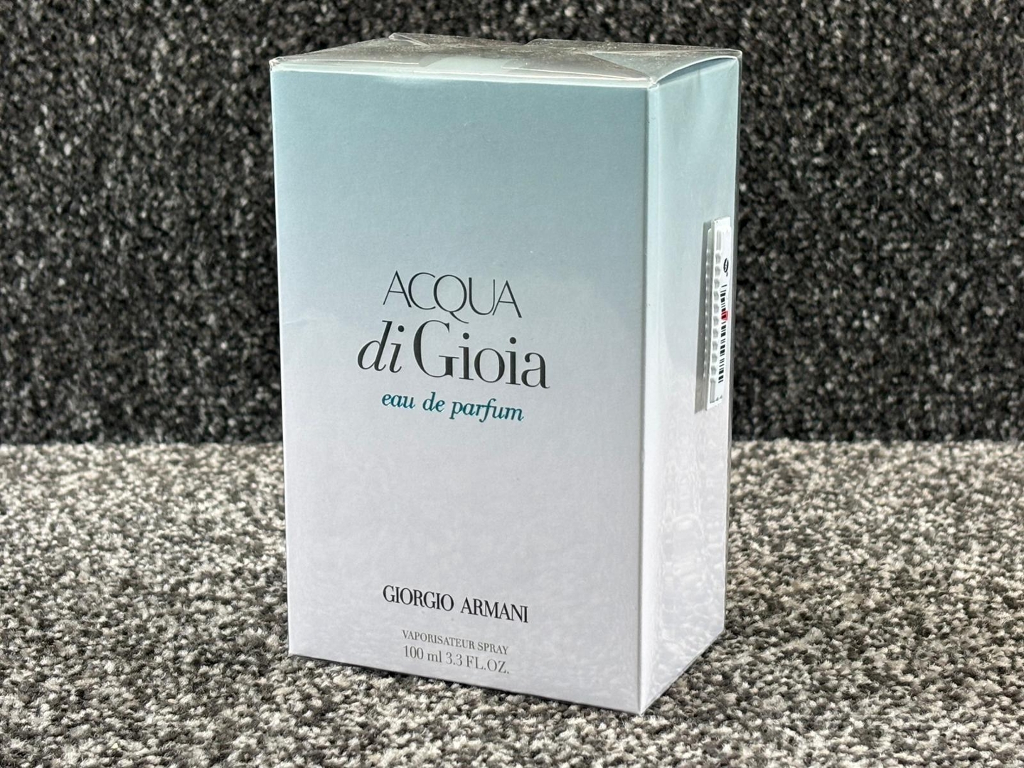 A 100ml bottle of Armani Acqua Di Gioia Eau De Parfum, presented in its original presentation box and embodying a fresh, elegant fragrance inspired by nature and serenity. This refined scent reflects Armani’s signature approach to understated luxury, offering a clean and modern expression of femininity.