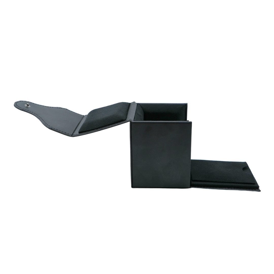 The interior is lined with a soft black fabric and fitted with a cushioned central pillow, ensuring the watch is held securely while travelling or in storage. A snap-button closure provides practical security without compromising the streamlined design, making it ideal for both daily use and longer journeys.